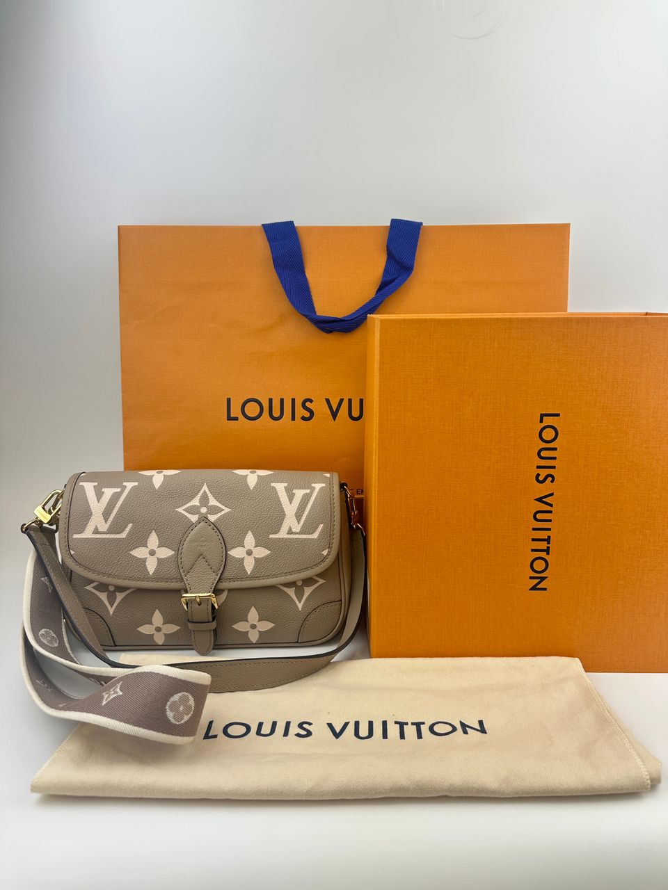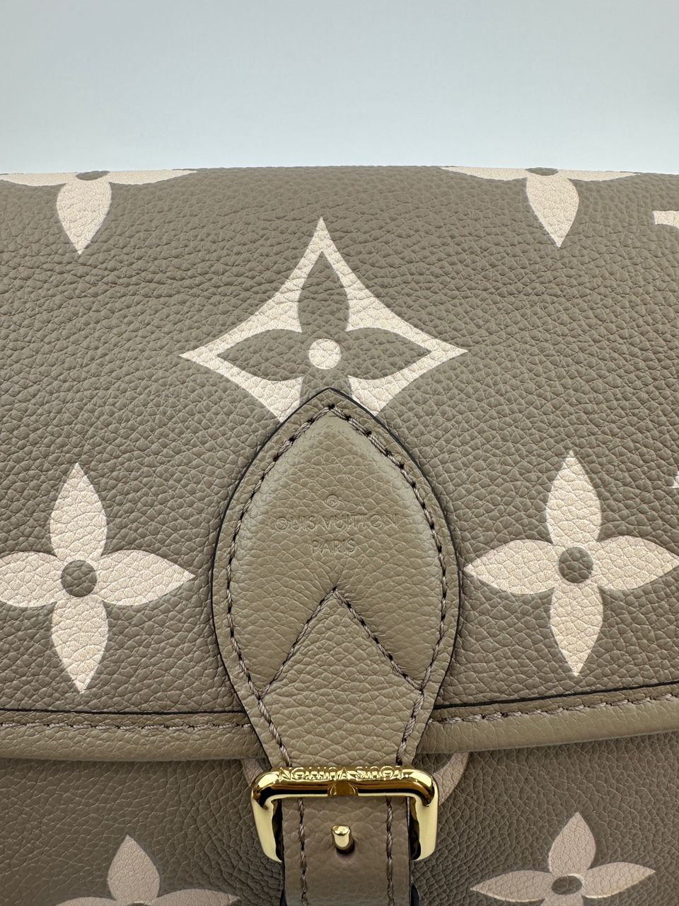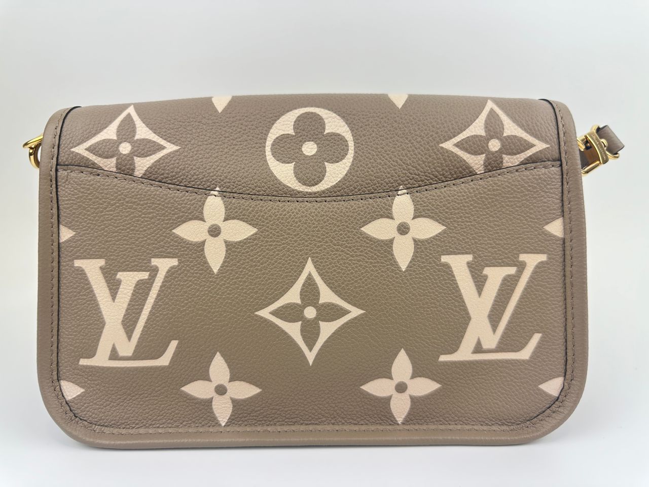 The Louis Vuitton Diane MM in Tourterelle Beige and Cream Monogram Empreinte leather is a masterful blend of artisanal craftsmanship and contemporary elegance. Made from calf leather embossed with the iconic LV monogram, it features sleek gold-tone hardware, a removable strap for crossbody or shoulder carry. Refined yet versatile, it’s the ideal companion for both elevated daytime looks and sophisticated evenings.