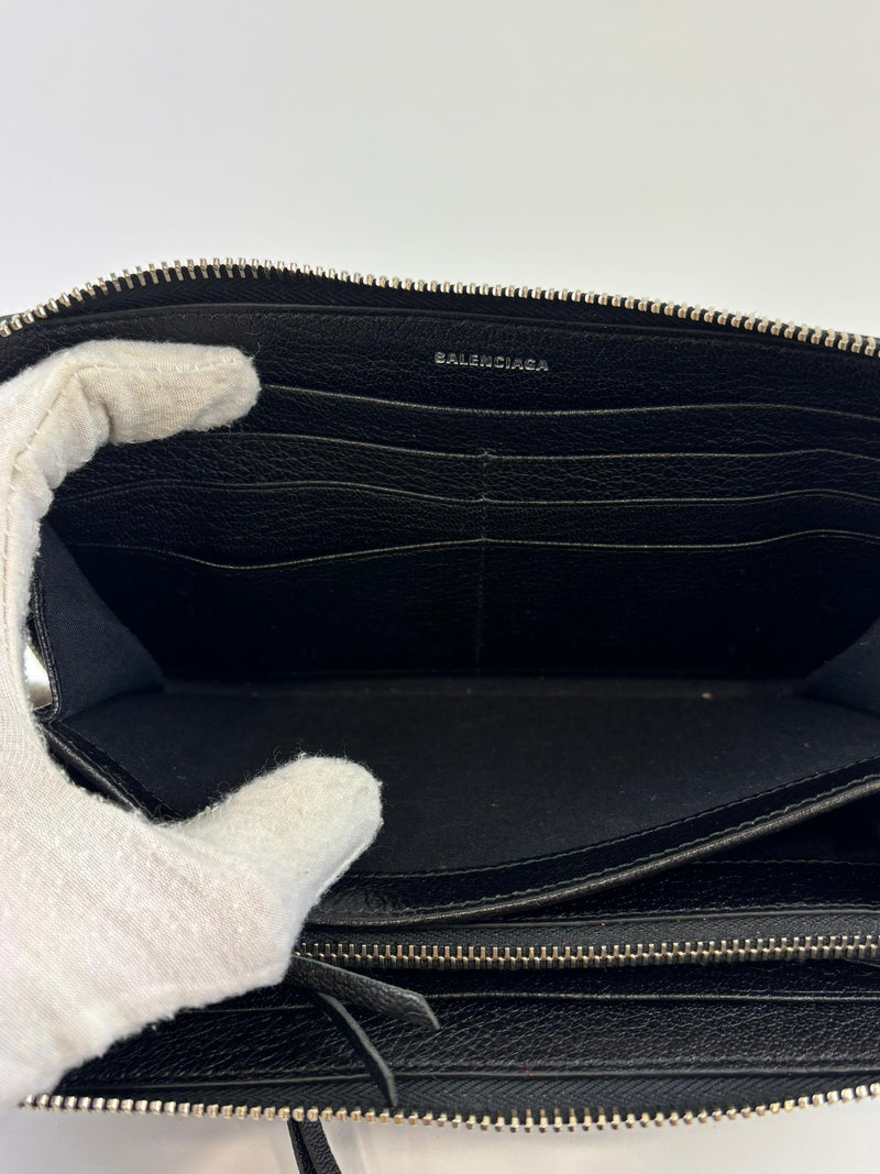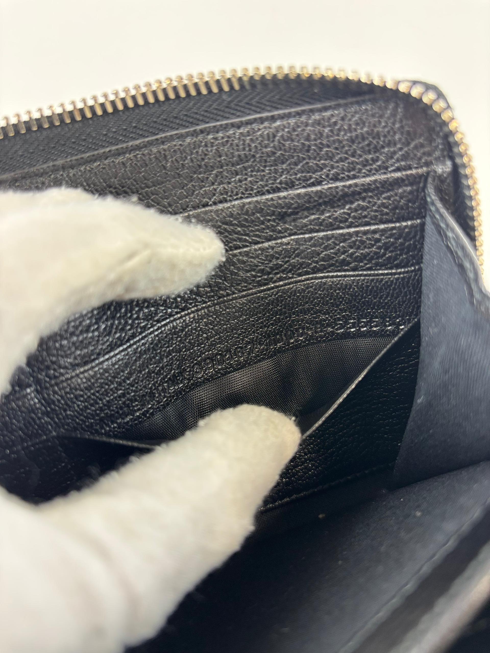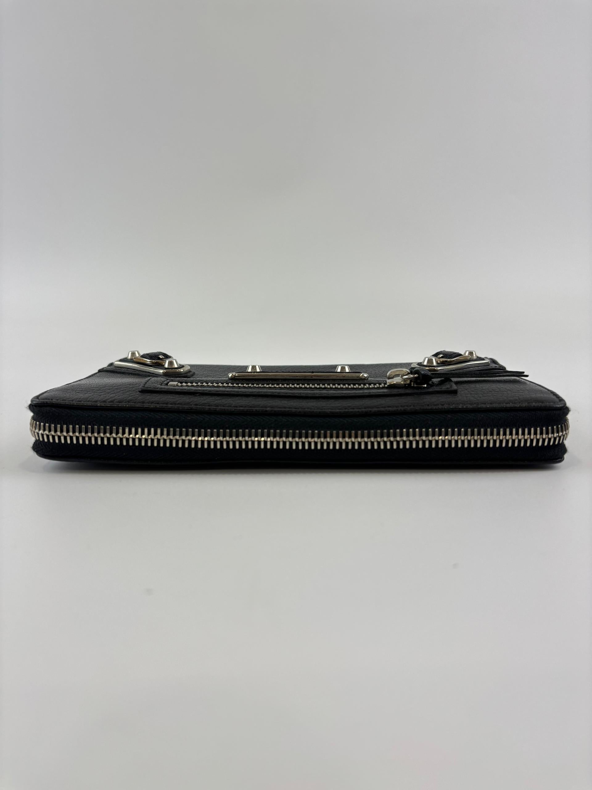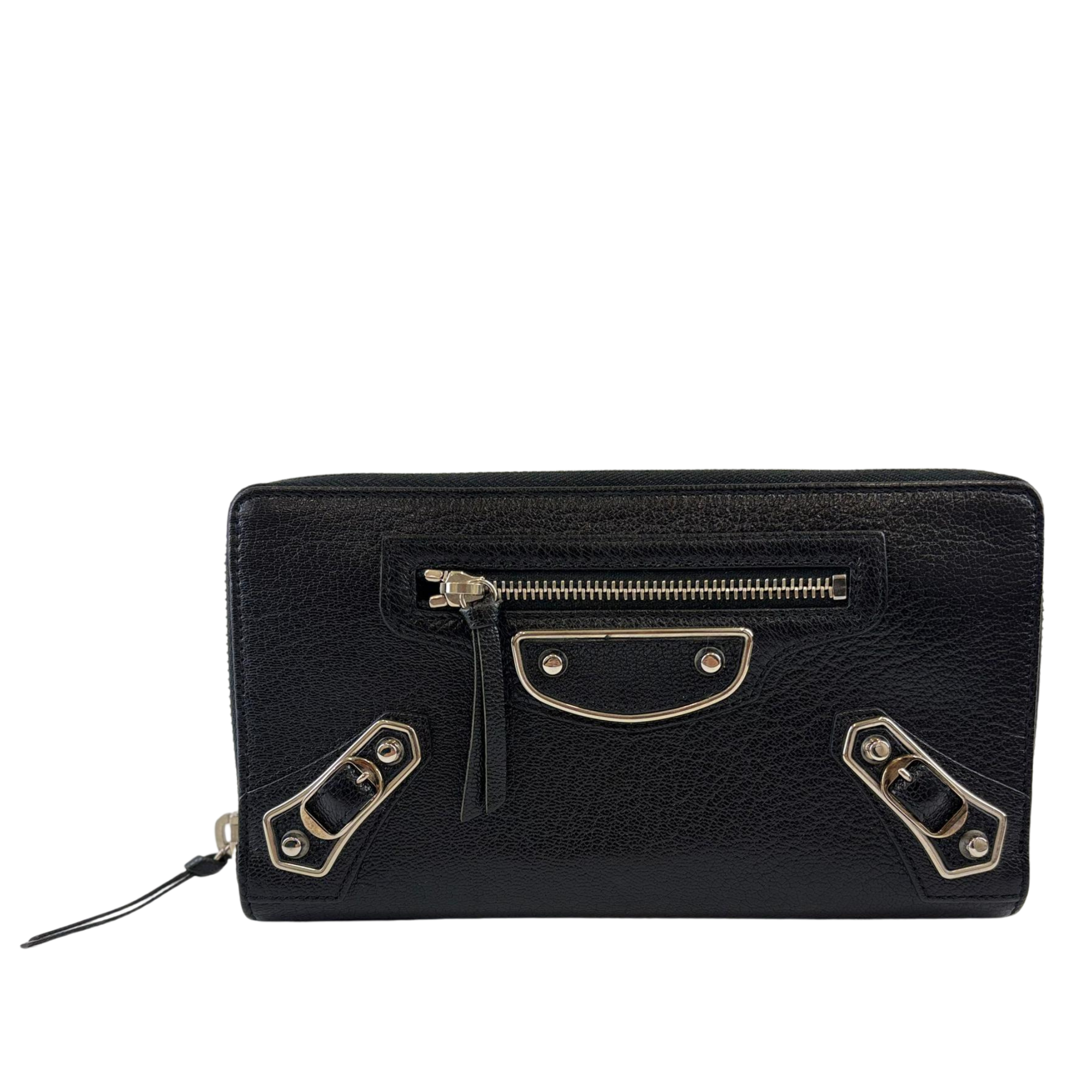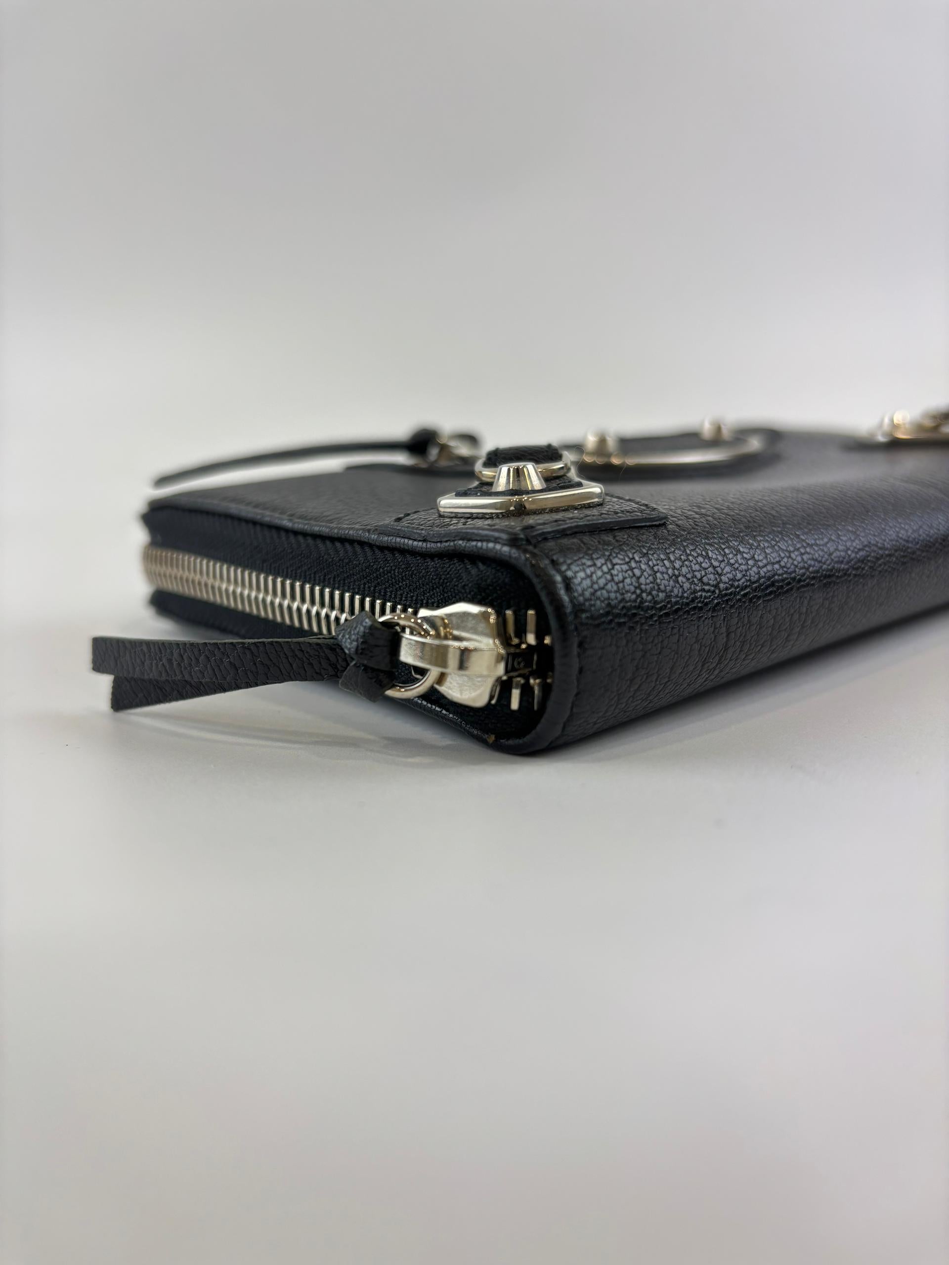 This Balenciaga Metallic Edge Continental Zip Around Wallet is crafted from premium black grained chevre leather, offering a refined texture and durable finish. Its sleek metallic edge detailing enhances the wallet’s contemporary elegance, while the zip-around design provides secure and organized storage for cards, cash, and essentials.