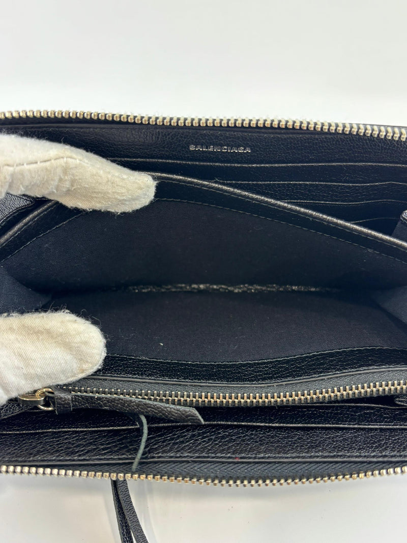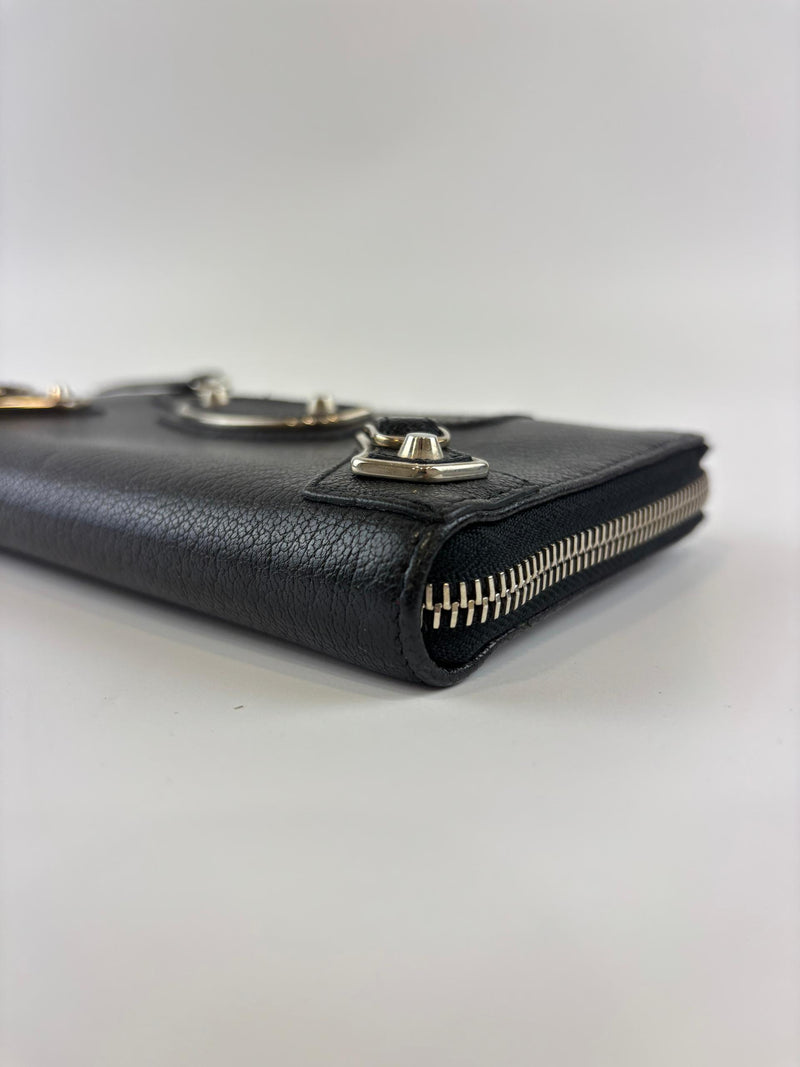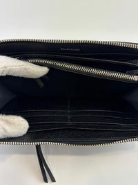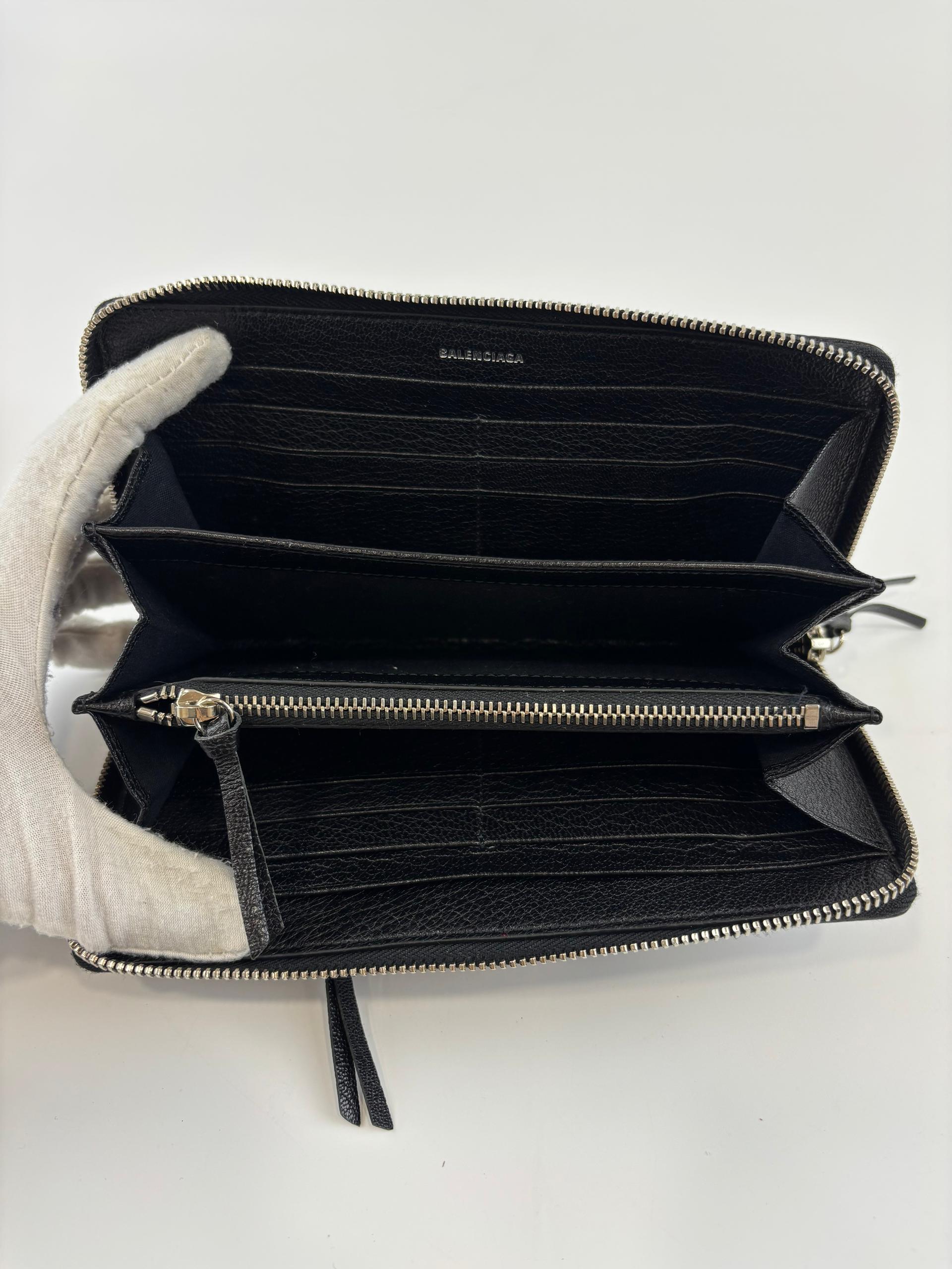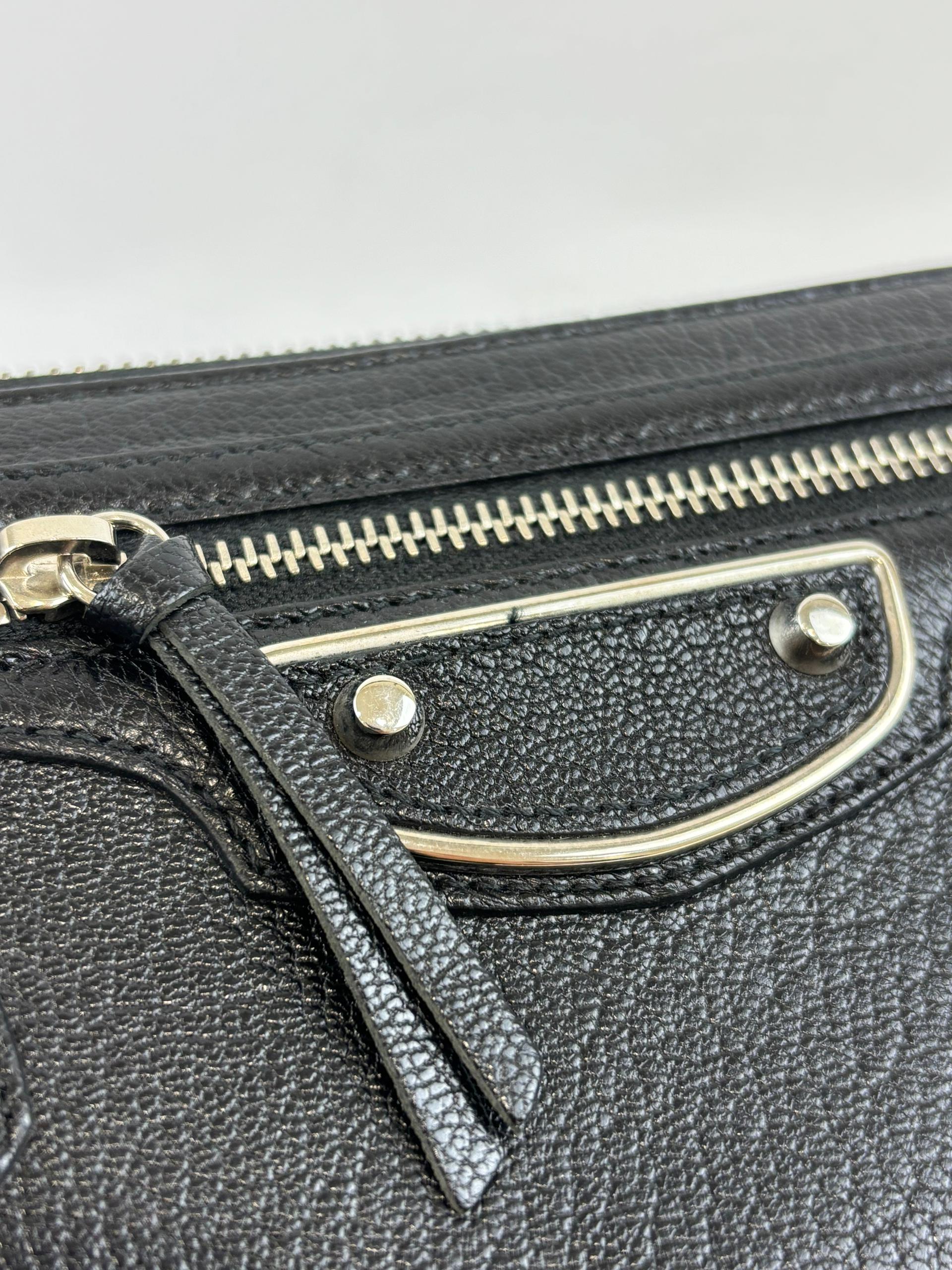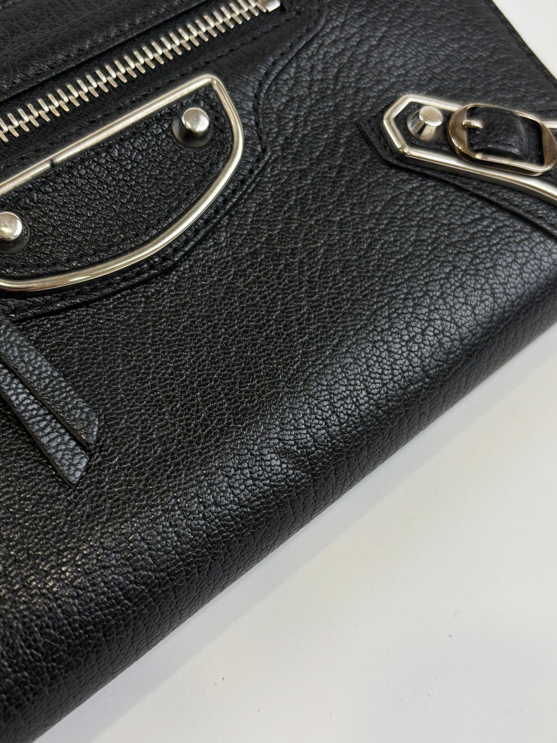 This Balenciaga Metallic Edge Continental Zip Around Wallet is crafted from premium black grained chevre leather, offering a refined texture and durable finish. Its sleek metallic edge detailing enhances the wallet’s contemporary elegance, while the zip-around design provides secure and organized storage for cards, cash, and essentials.
