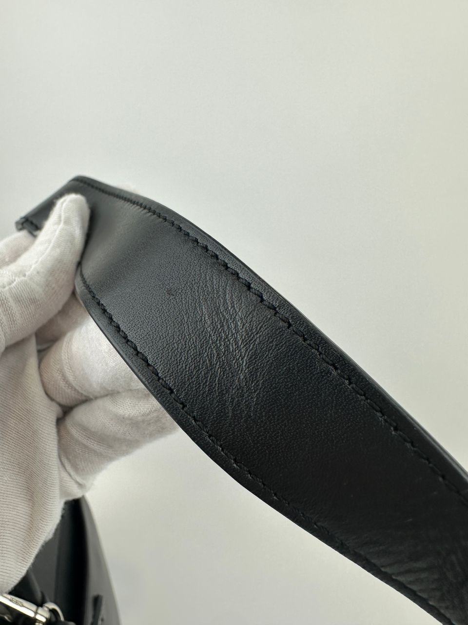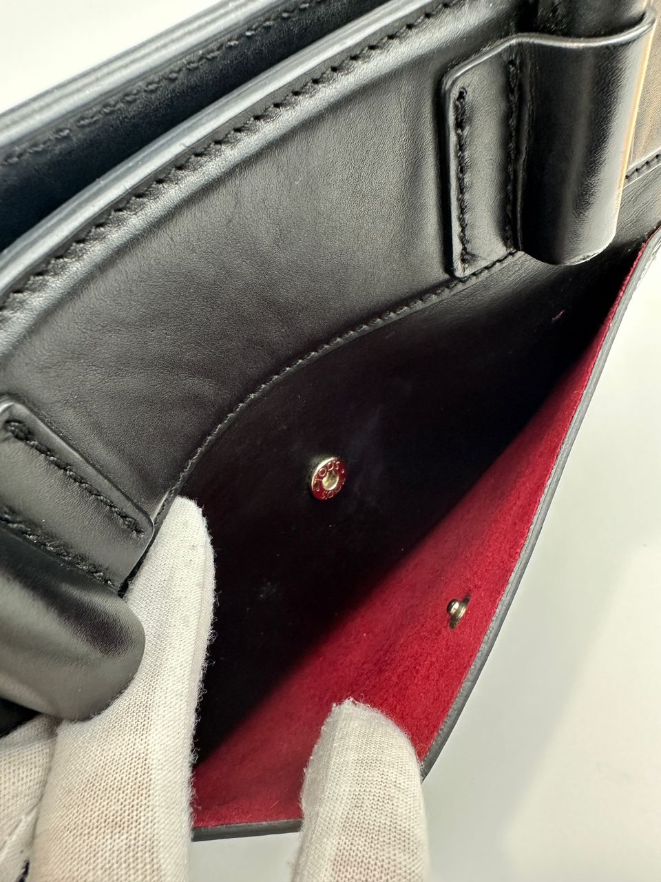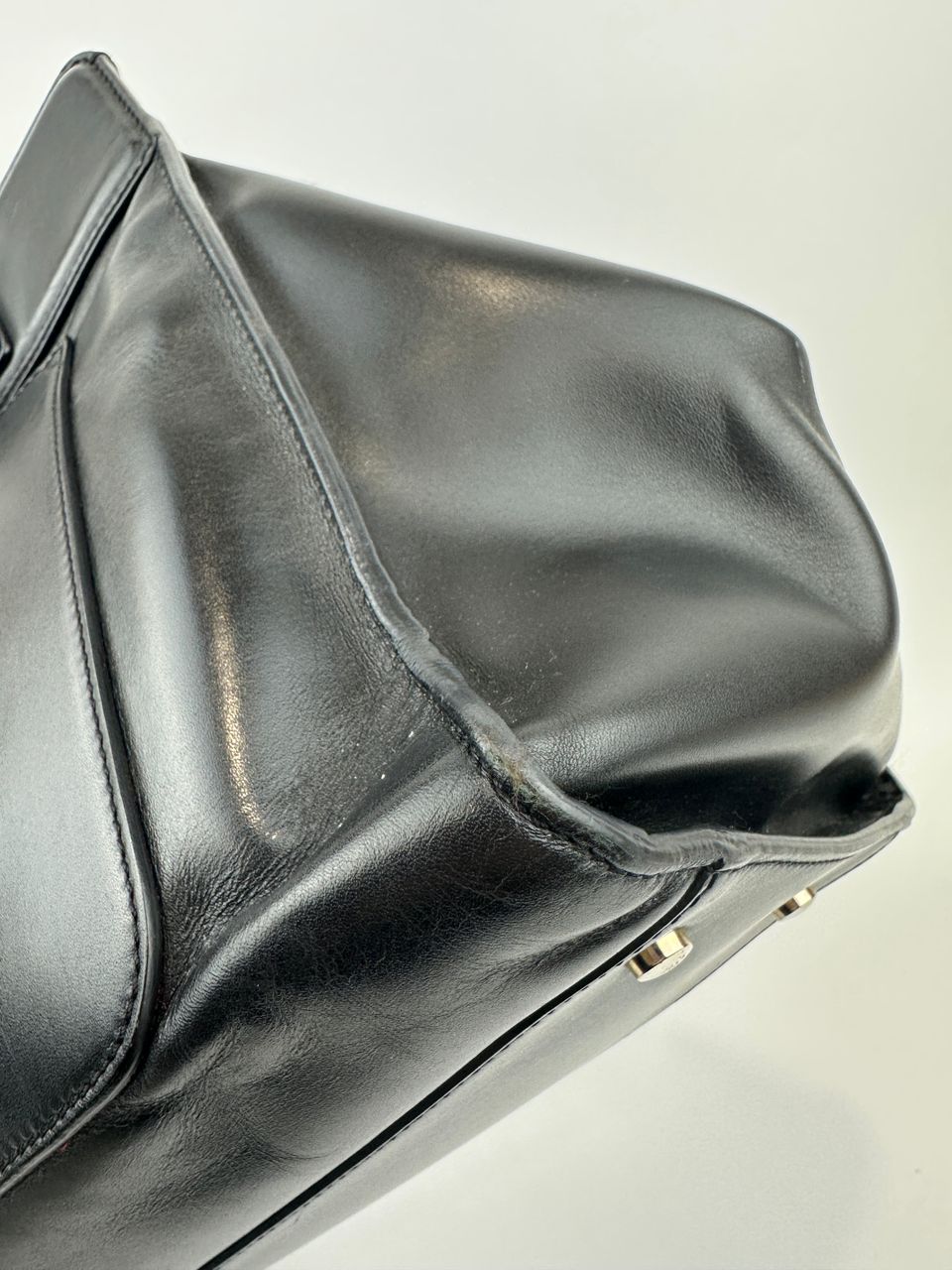 Remarks: Used in good condition; stains on leather & interior, make up residue on handles, minor wear signs on glazing, handles & strap out of shape, light scuffs & dirt marks on exterior.