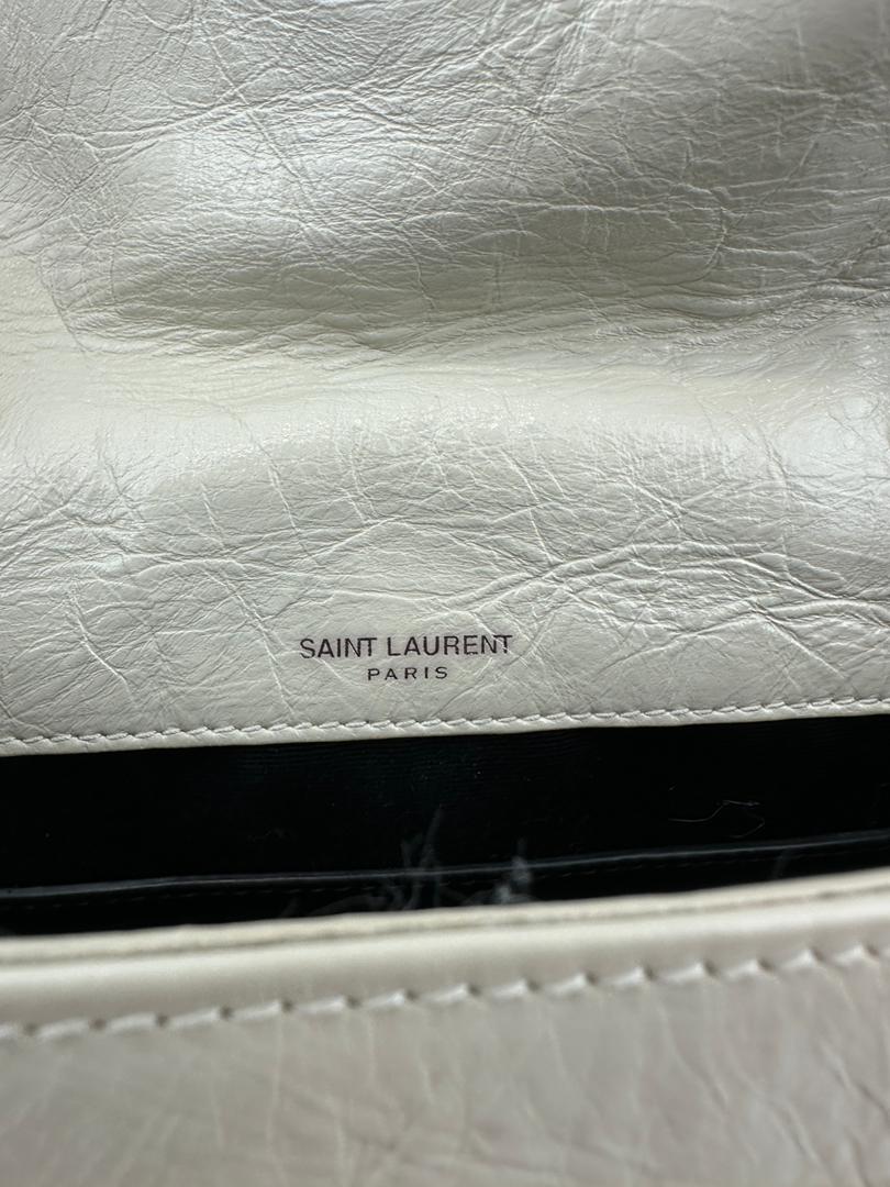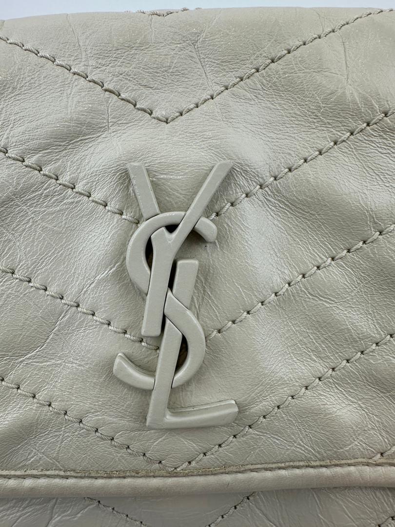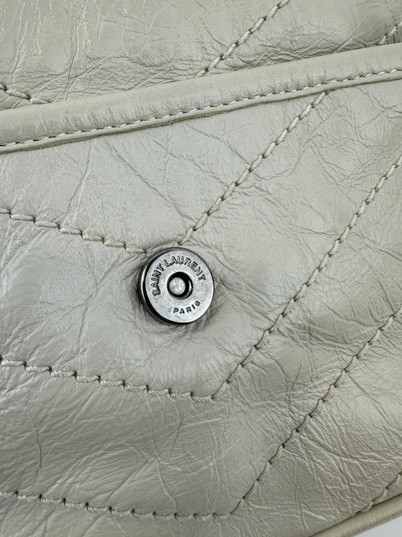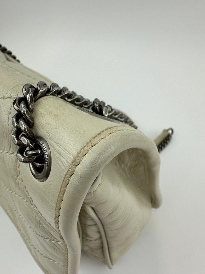 The Saint Laurent Baby Niki Bag is crafted in white crinkled calfskin leather for a chic, vintage-inspired look. Detailed with tonal hardware and the iconic YSL monogram, it combines understated elegance with modern edge. Compact yet practical, it’s the perfect everyday companion.