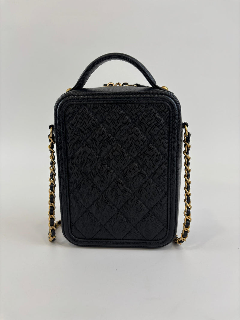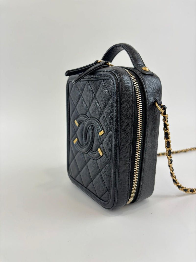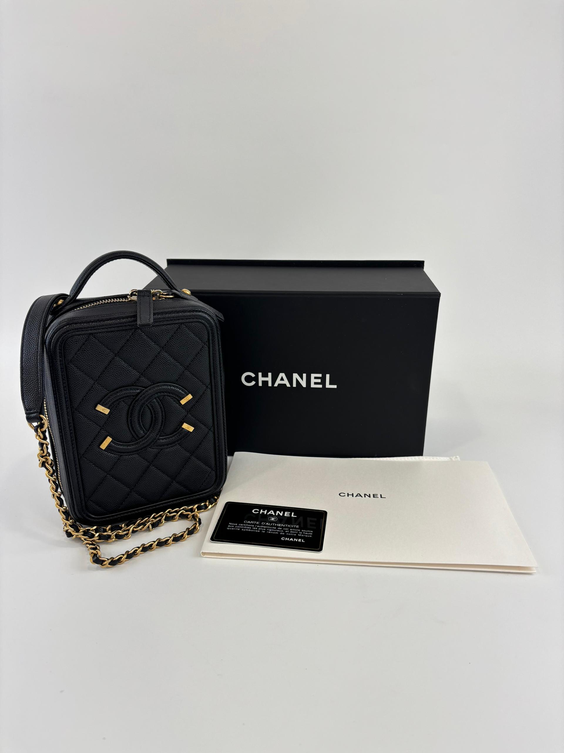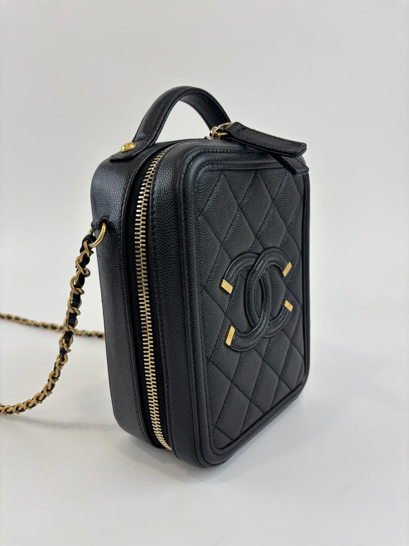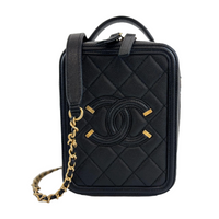 The Chanel Filigree Vertical Vanity Bag features an elegant vertical design adorned with delicate filigree patterns, showcasing exquisite craftsmanship. Its structured silhouette offers a refined and timeless look, perfect for carrying essentials with style. This sophisticated accessory blends classic charm with contemporary flair, making it an ideal choice for those who appreciate luxury and attention to detail.