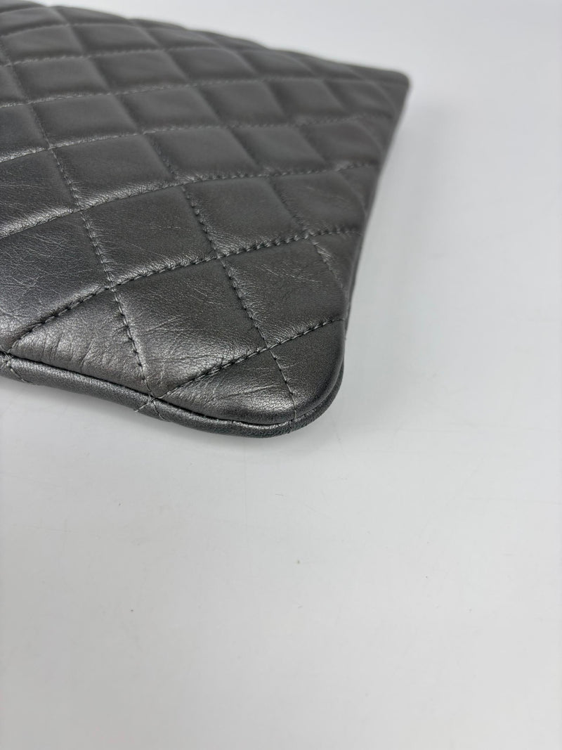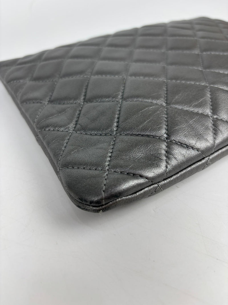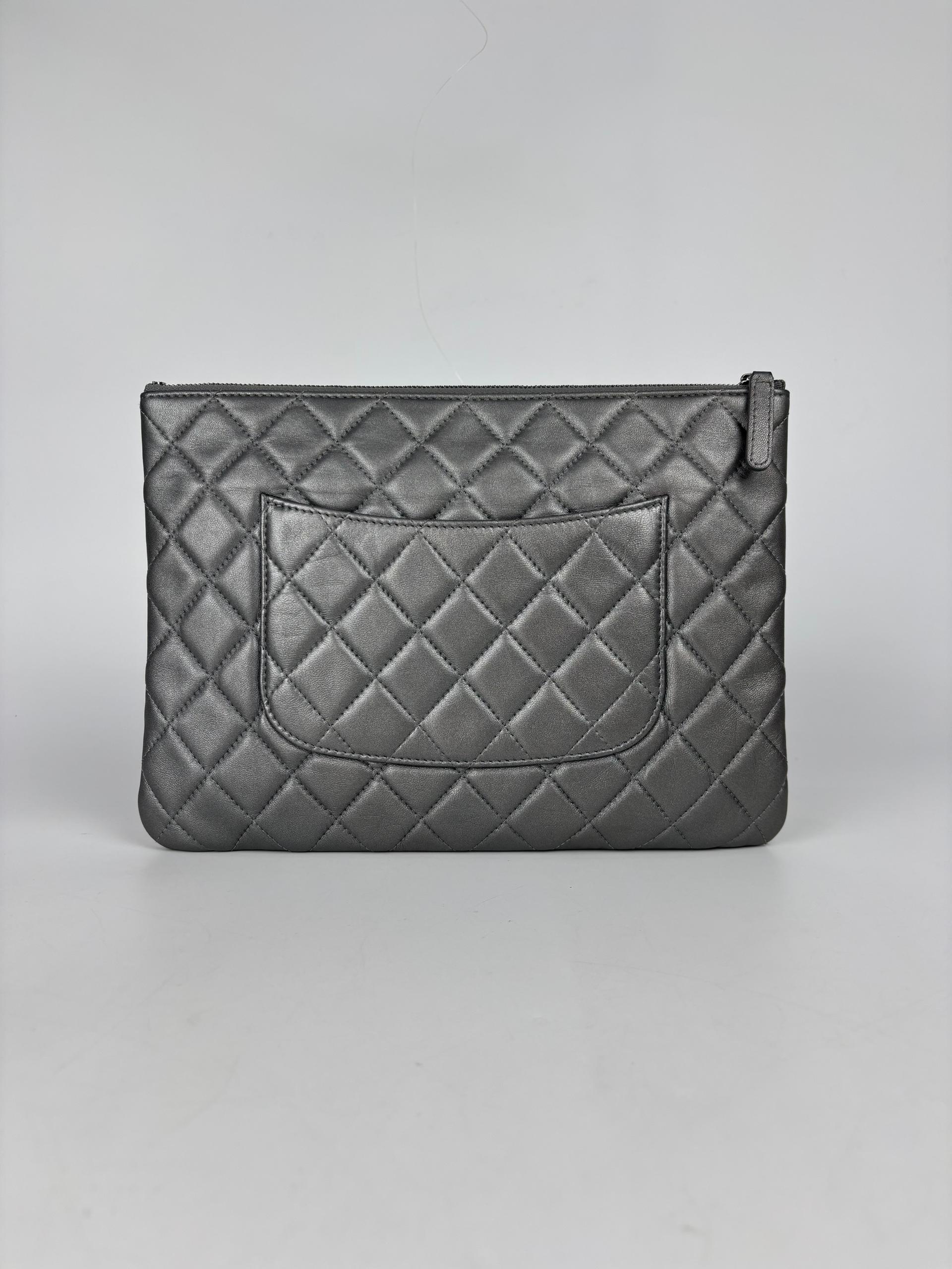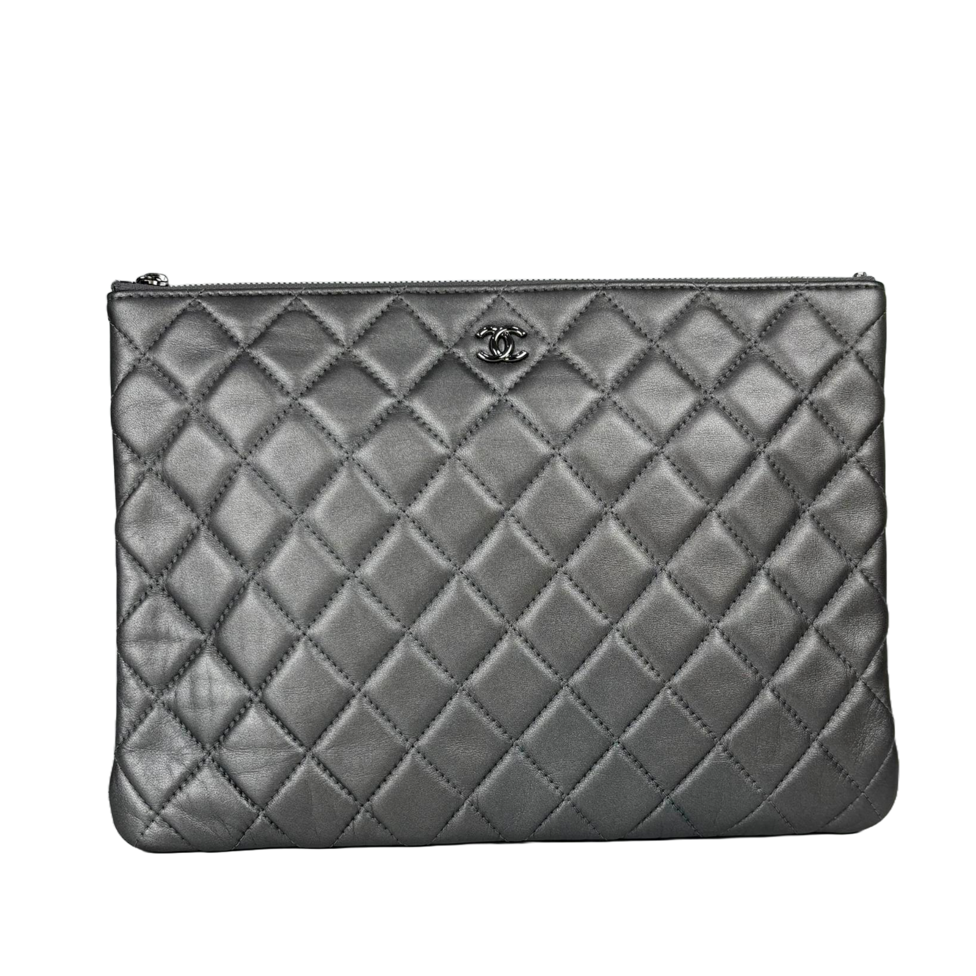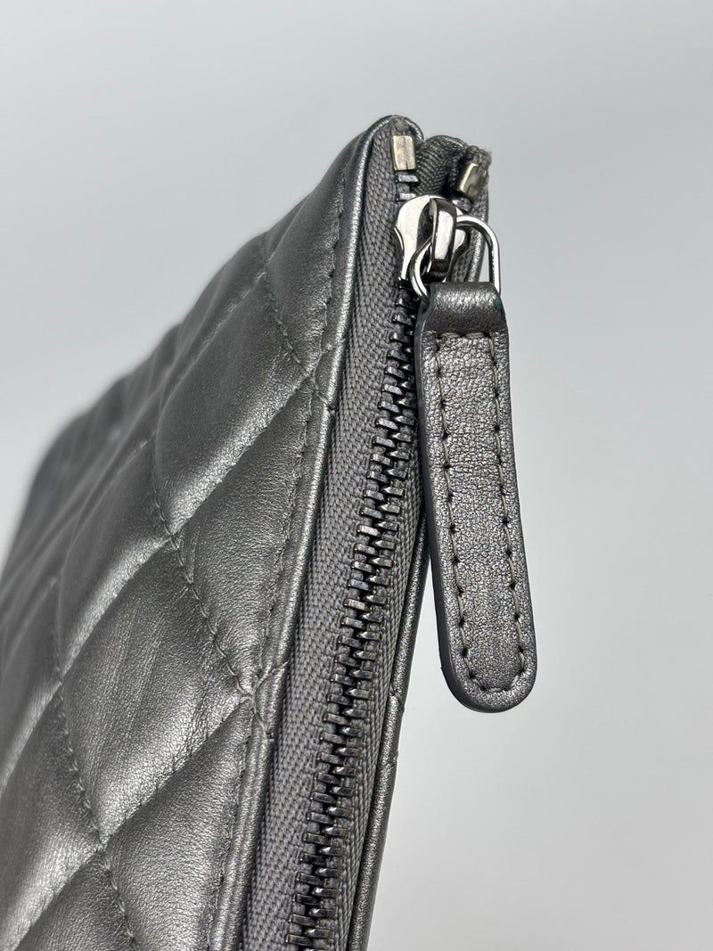 Crafted from luxurious grey lambskin leather, this Chanel Medium O Case Clutch features a signature quilted design that exudes timeless elegance. Versatile in function, it can be carried as a sleek clutch or used as a refined handbag organizer, seamlessly combining style with practicality for the sophisticated individual.
