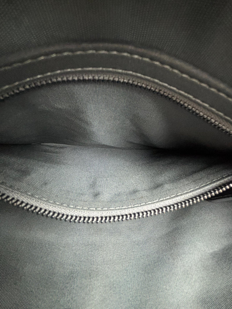 Remarks: Used in good condition, some signs of use; scuffs on exterior edges, minor loss of color on zipper, minor dirt mark on front exterior & minor stain on interior back pocket lining.