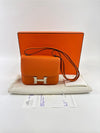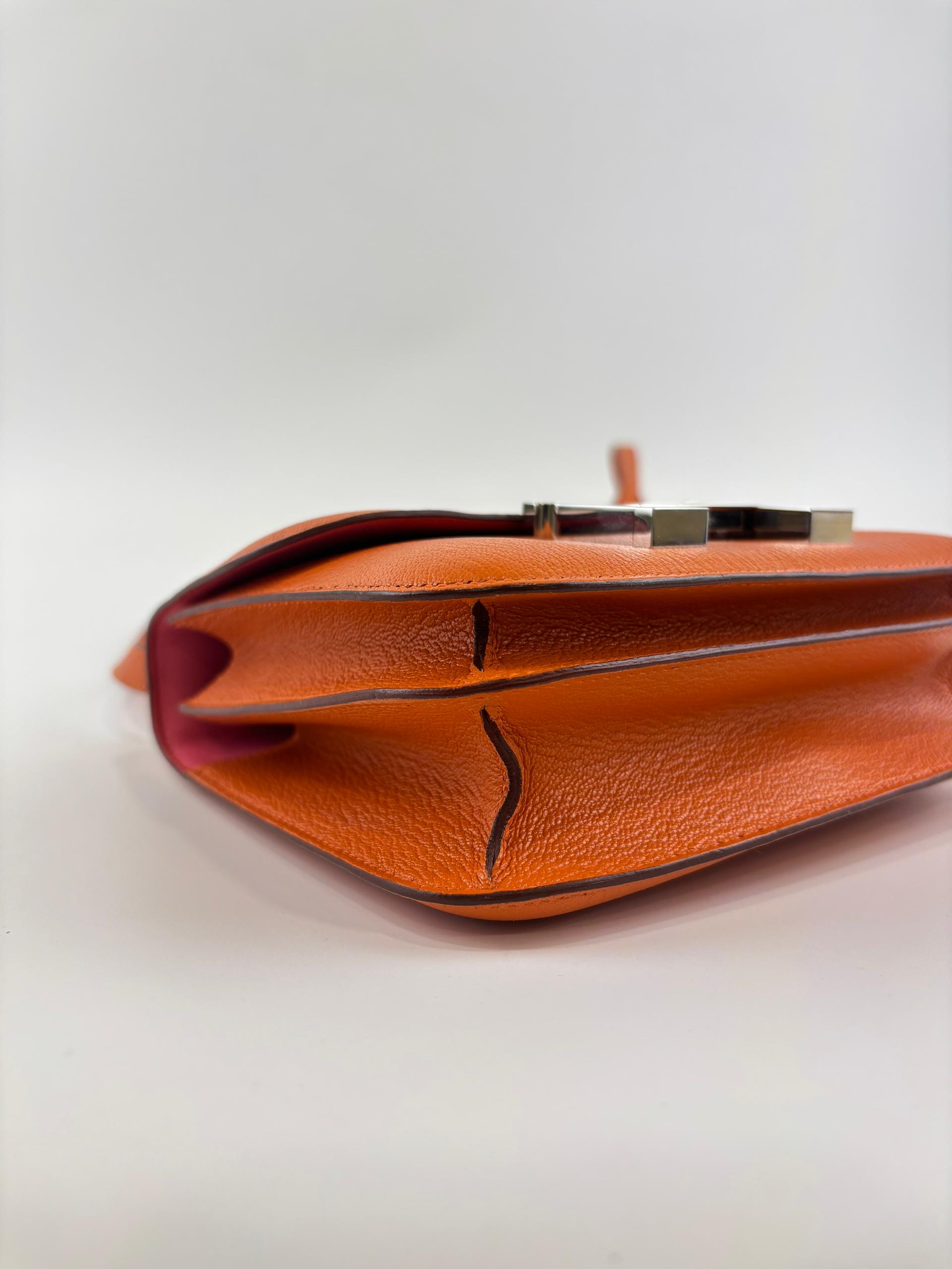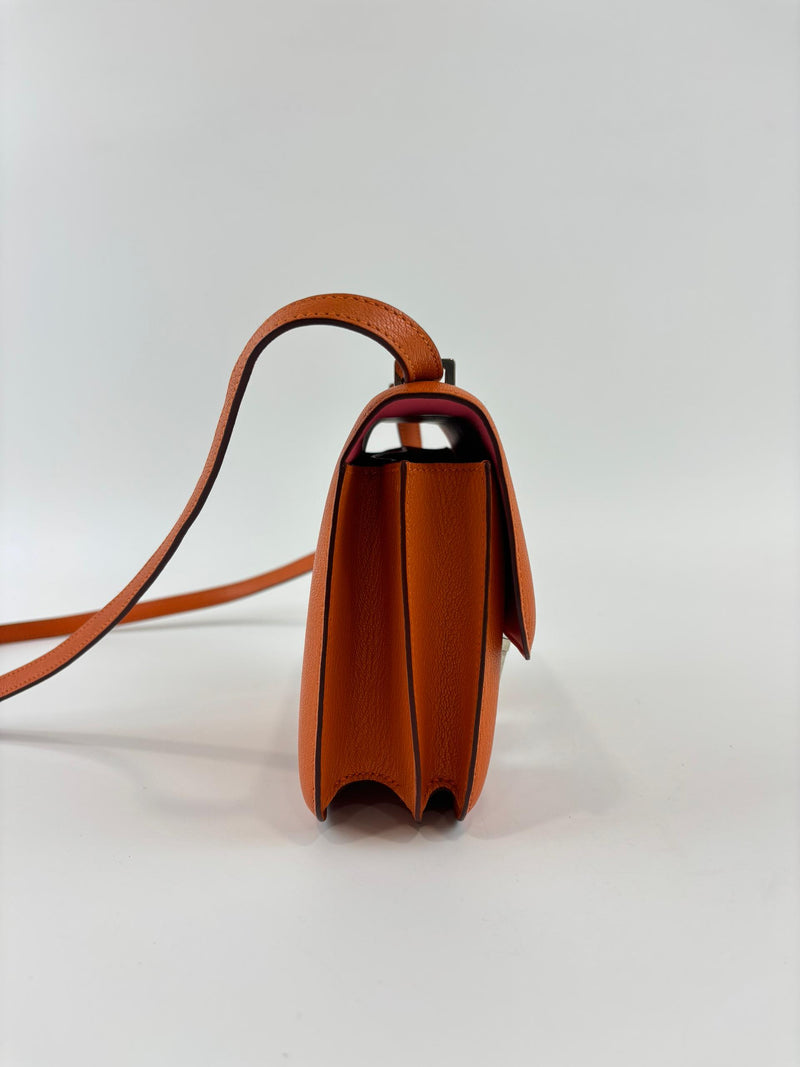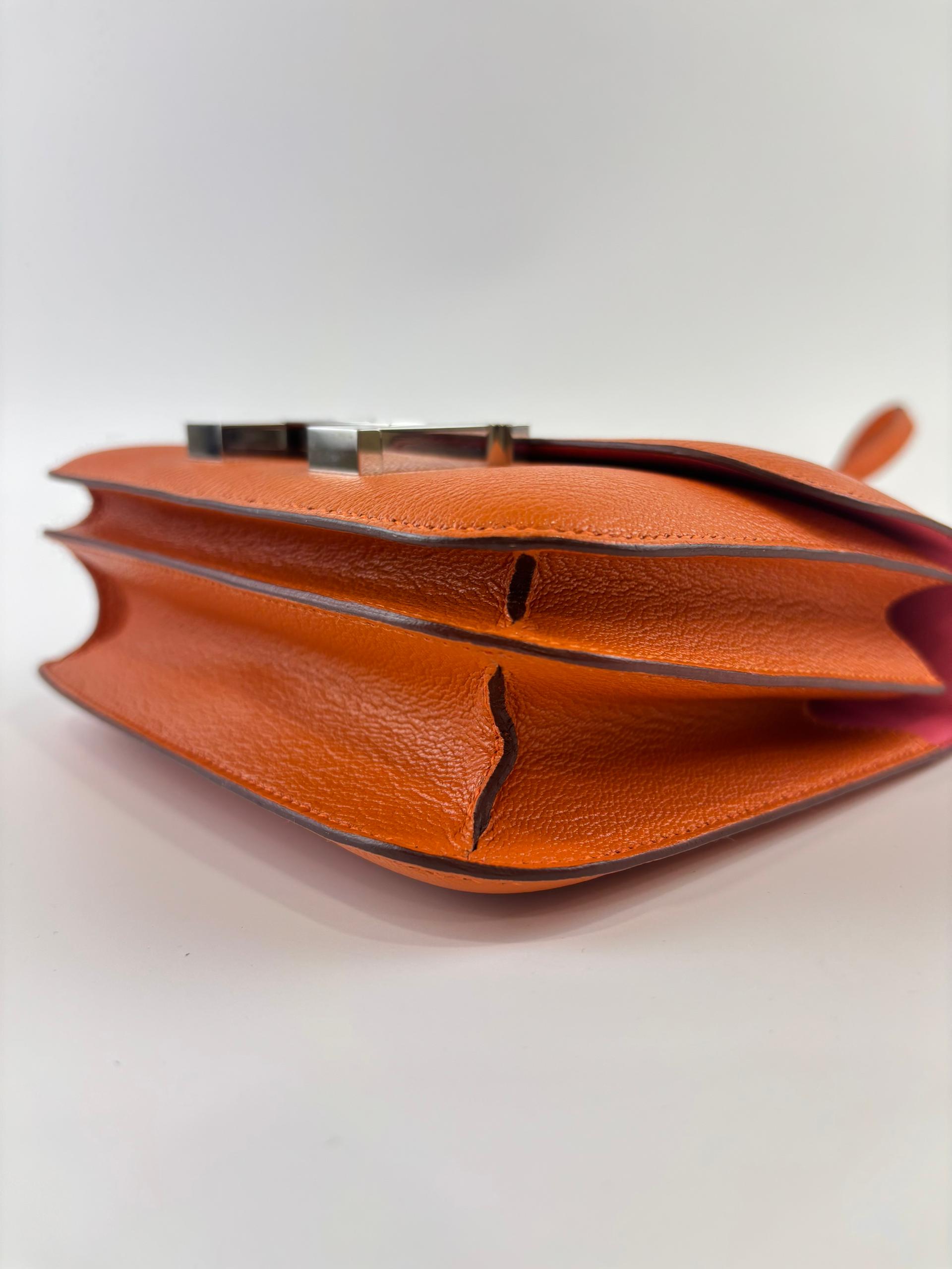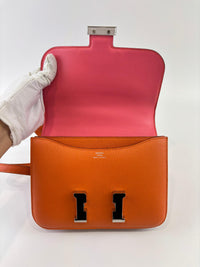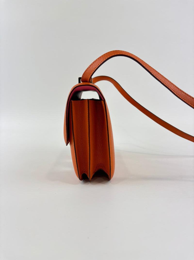 The Hermès Constance 18 in Orange and Rose Azalée Chevre Mysore leather showcases impeccable craftsmanship and refined elegance. Compact at 18 cm, it is perfect for carrying essentials with effortless style. The vibrant orange, delicately complemented by rose tones, creates a sophisticated pop of color, while the luxurious Chevre Mysore leather offers a smooth texture and enduring quality.