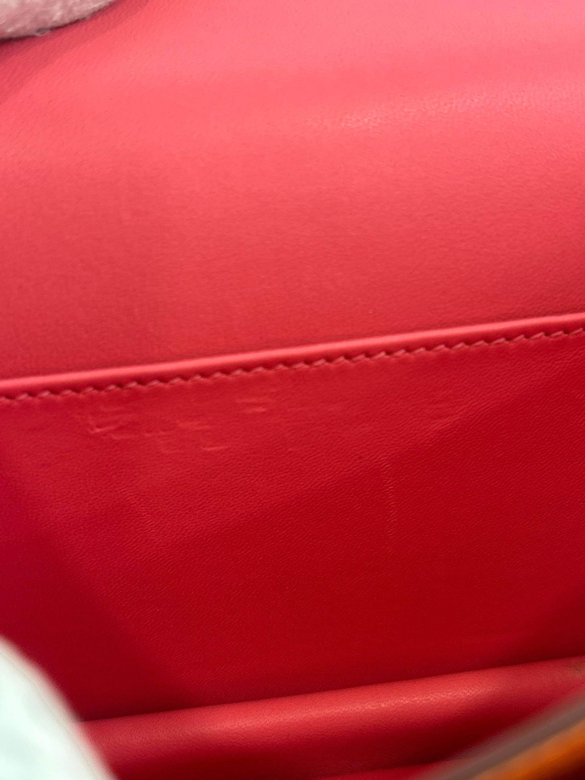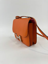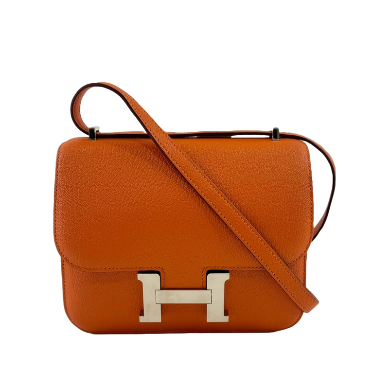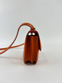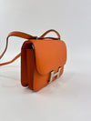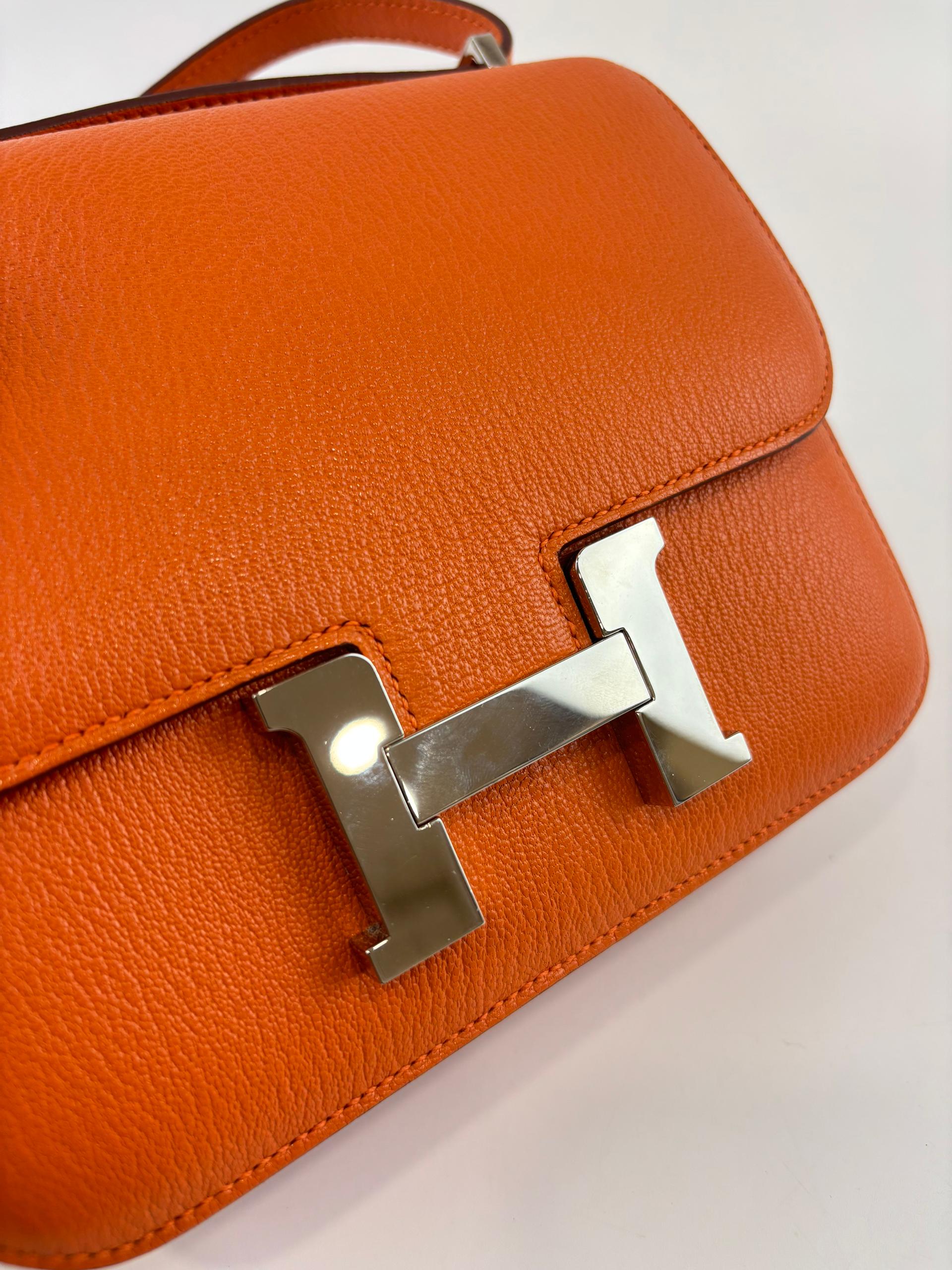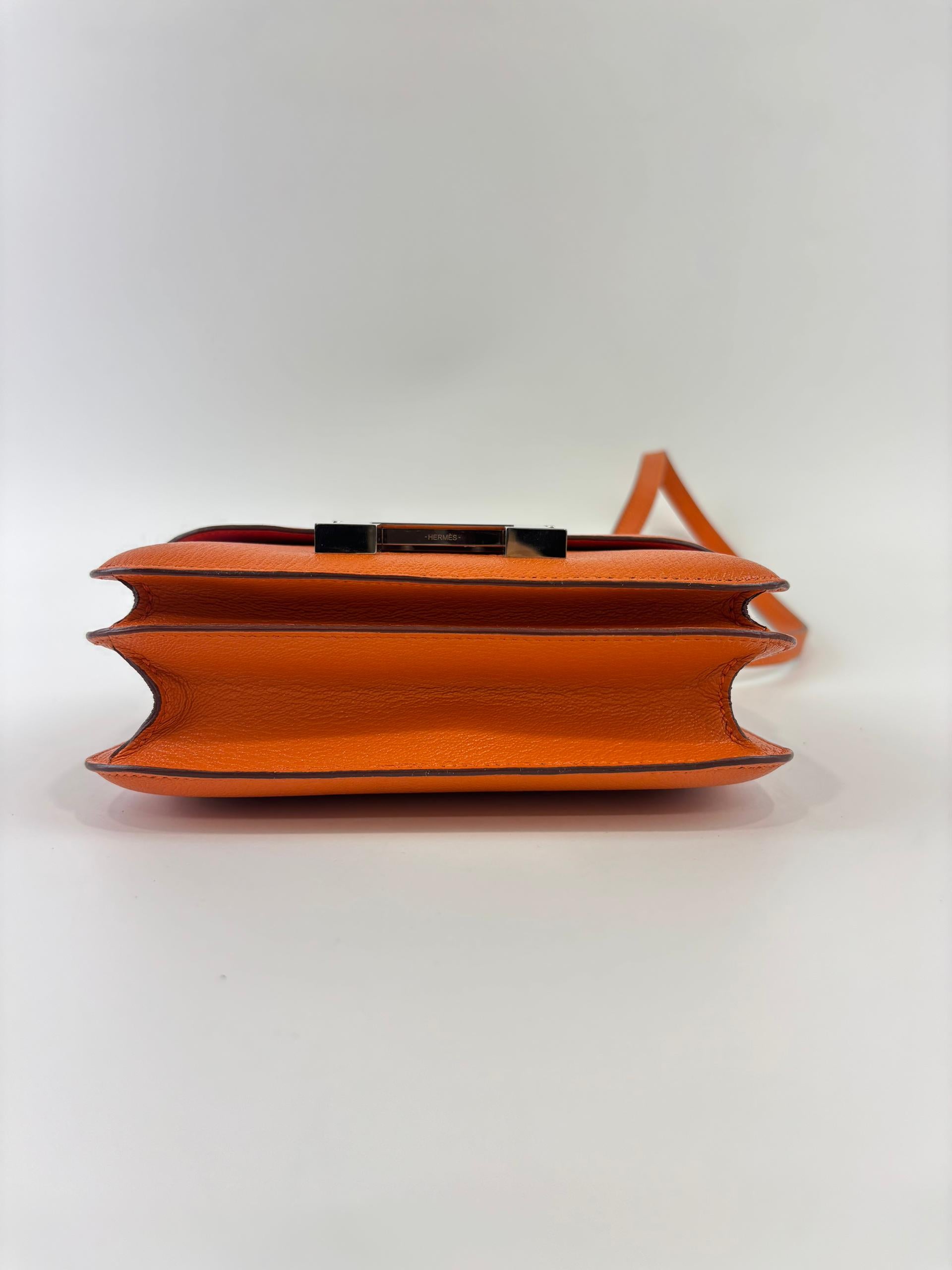 The Hermès Constance 18 in Orange and Rose Azalée Chevre Mysore leather showcases impeccable craftsmanship and refined elegance. Compact at 18 cm, it is perfect for carrying essentials with effortless style. The vibrant orange, delicately complemented by rose tones, creates a sophisticated pop of color, while the luxurious Chevre Mysore leather offers a smooth texture and enduring quality.