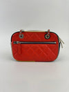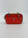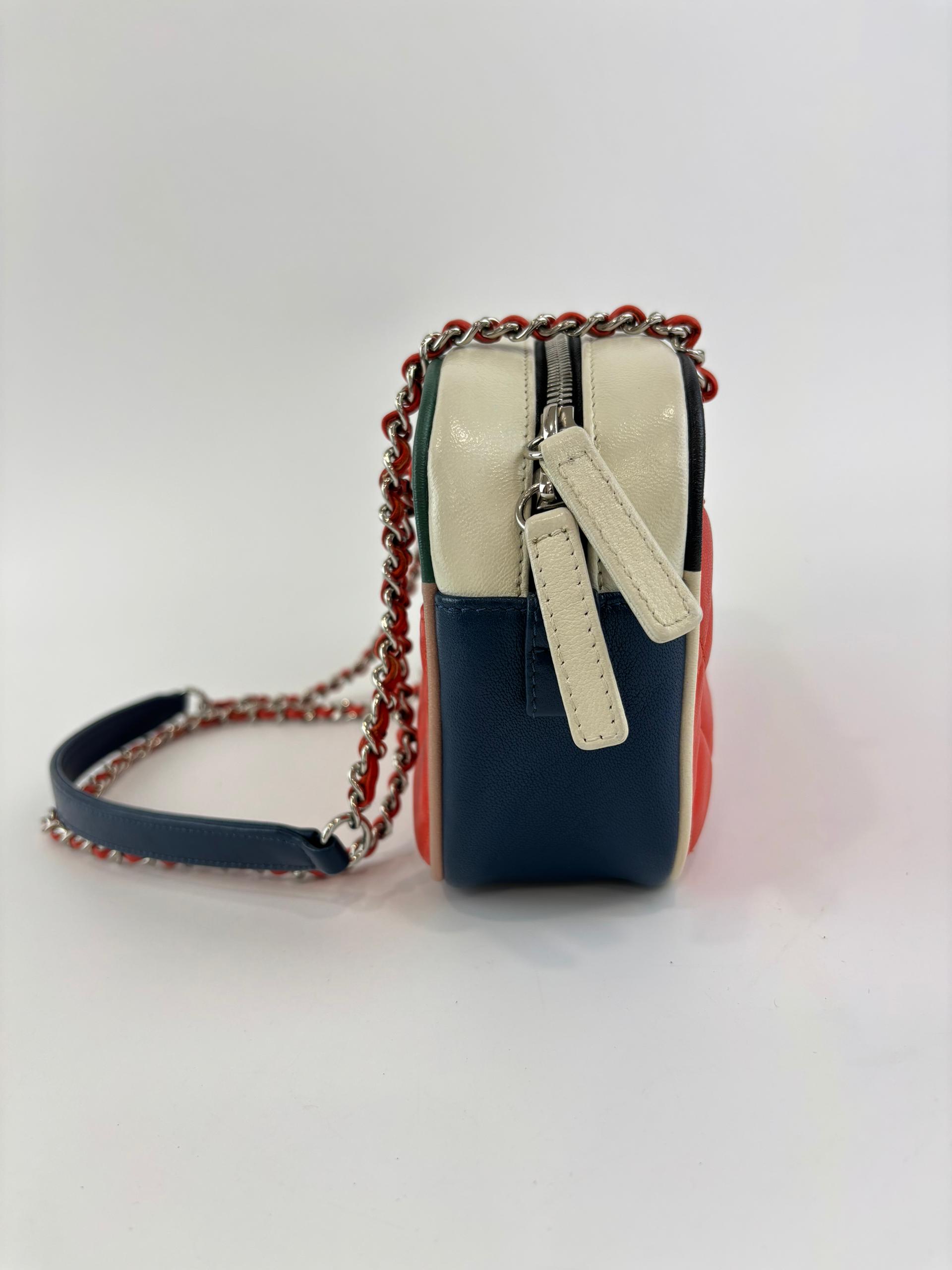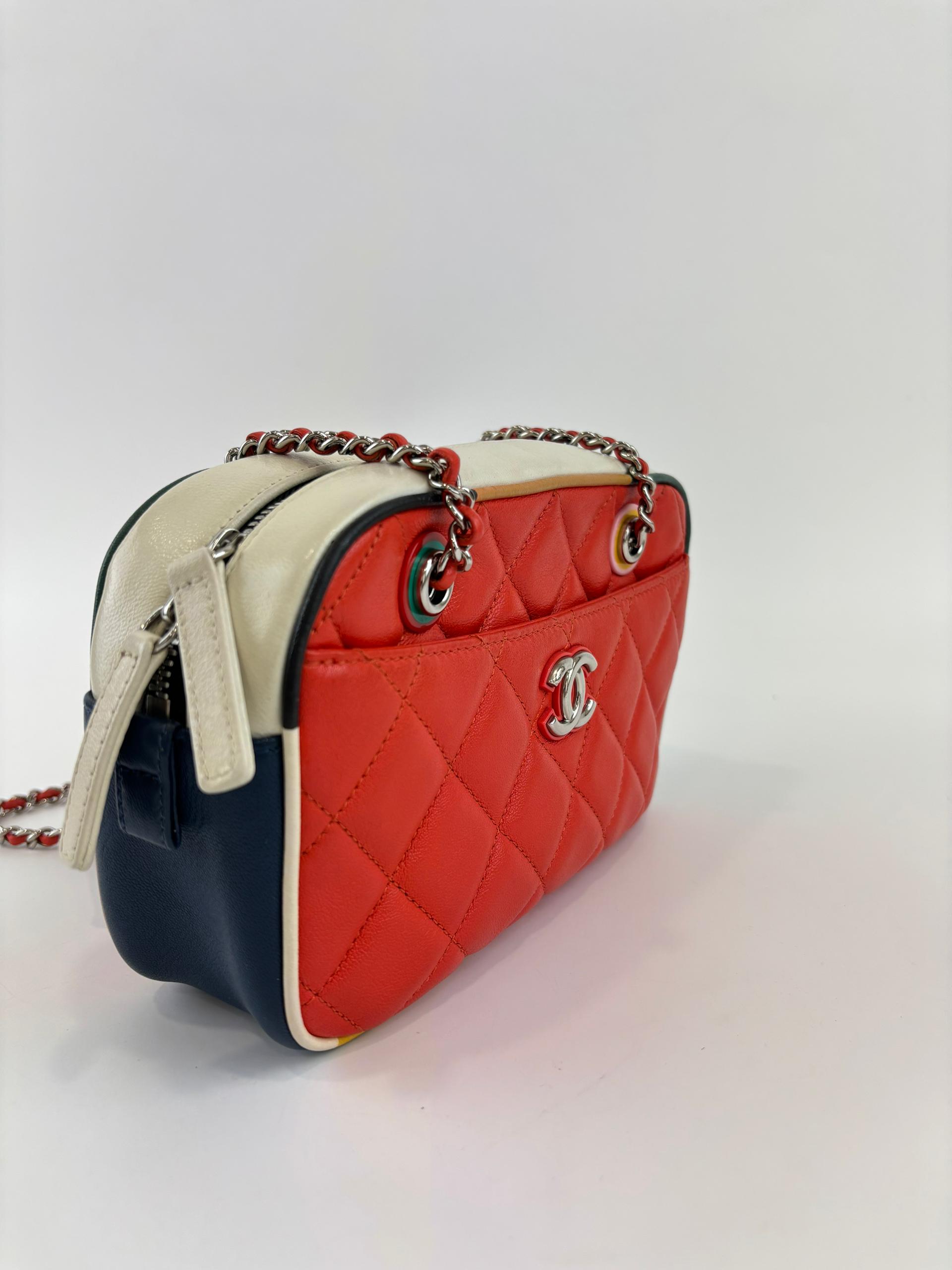Expertly crafted with vibrant red and multi-colored calf leather, the Chanel Cruise 2017 Small Camera Bag is a stylish and functional accessory. Its compact design is perfect for on-the-go fashionistas, while the high-quality material ensures durability. Elevate any outfit with this must-have addition to your collection.
