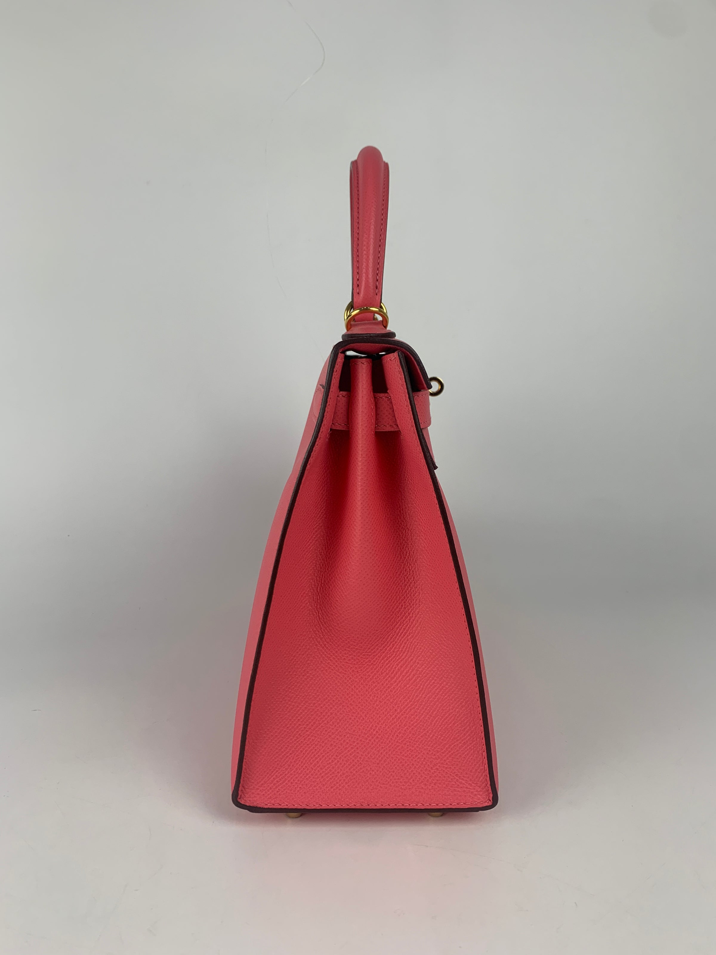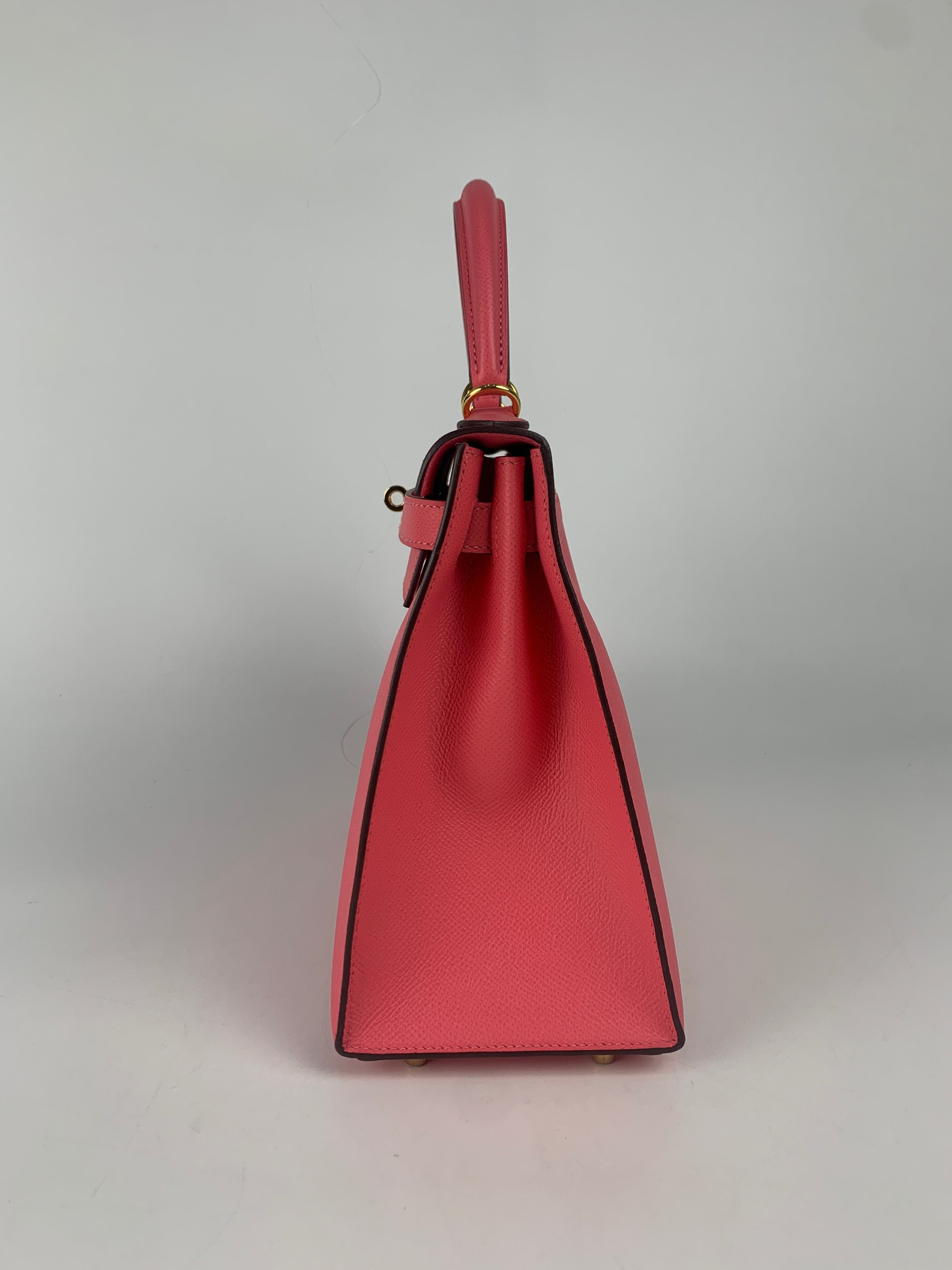 Crafted from durable Veau Epsom leather in a striking Rose Azalee hue, the Hermes Kelly 28 exudes quiet luxury with its refined texture and bold color. Its structured silhouette and gleaming gold hardware combine to create a sophisticated statement piece that elevates any ensemble with timeless elegance.