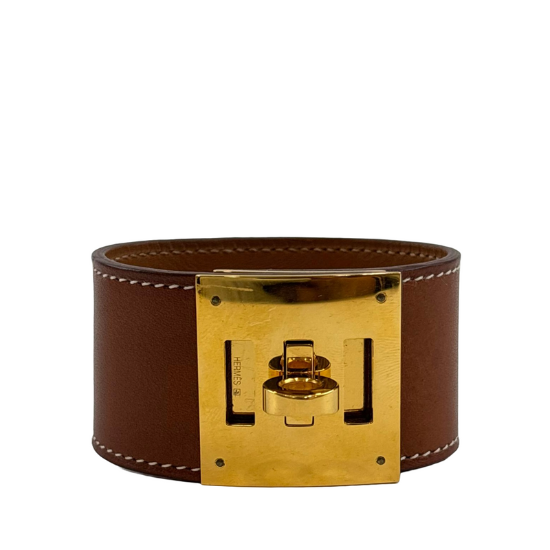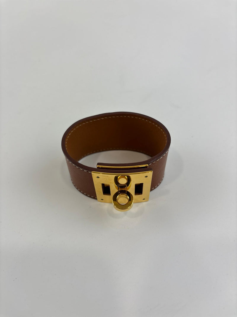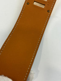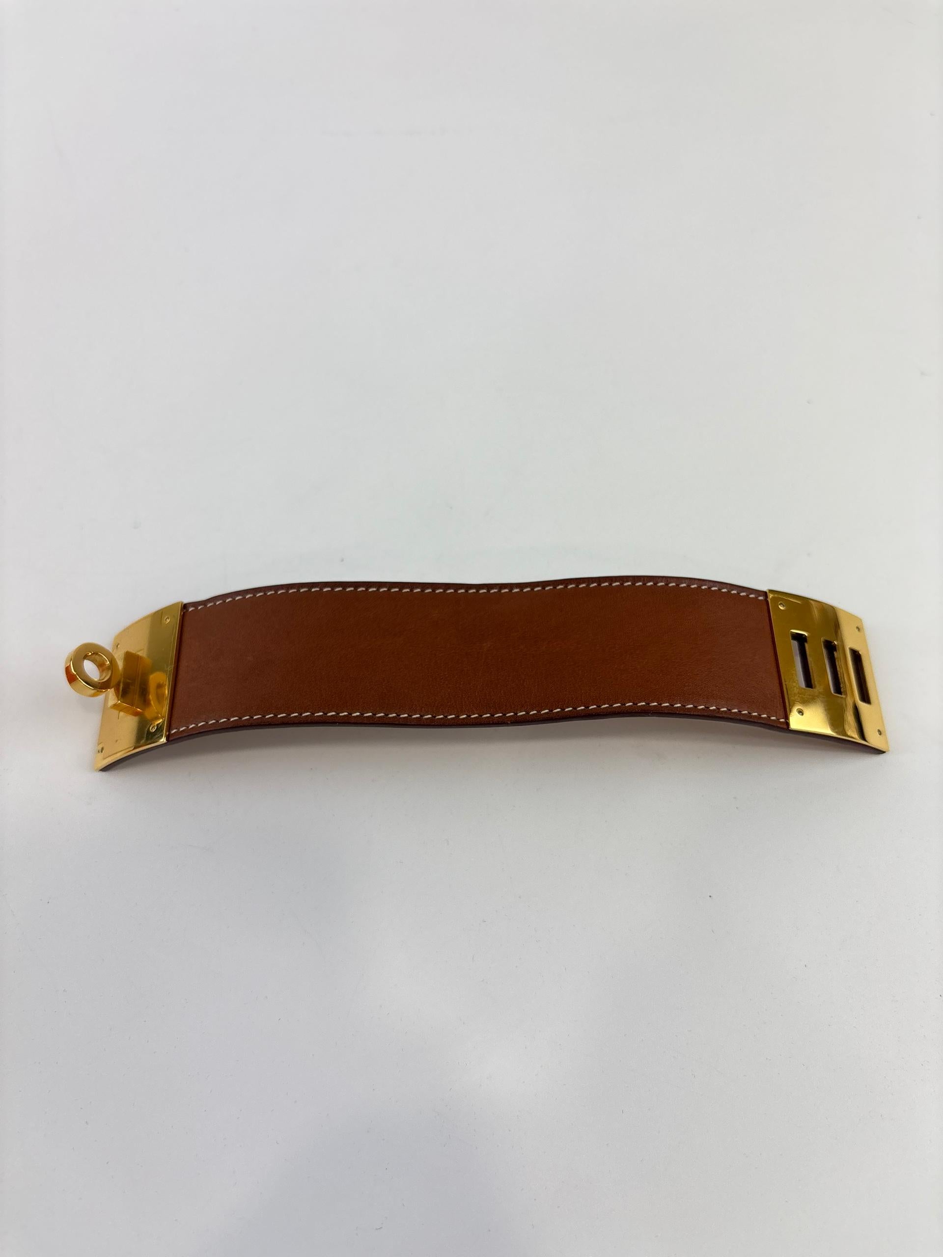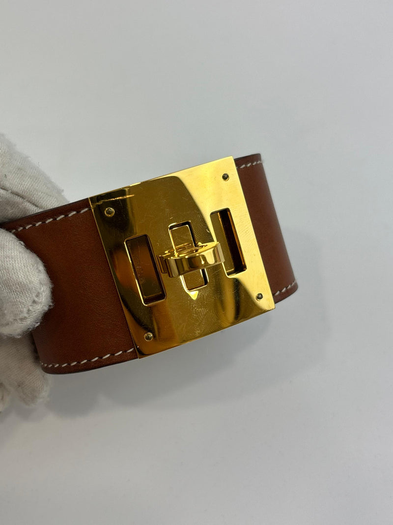 Elevate your accessory collection with the Hermes Kelly Dog Bracelet in Gold Swift leather, featuring gleaming gold hardware. This refined piece combines timeless elegance with modern craftsmanship, offering a subtle yet striking statement. Its sleek design and luxurious materials make it perfect for adding a touch of sophistication to any ensemble.