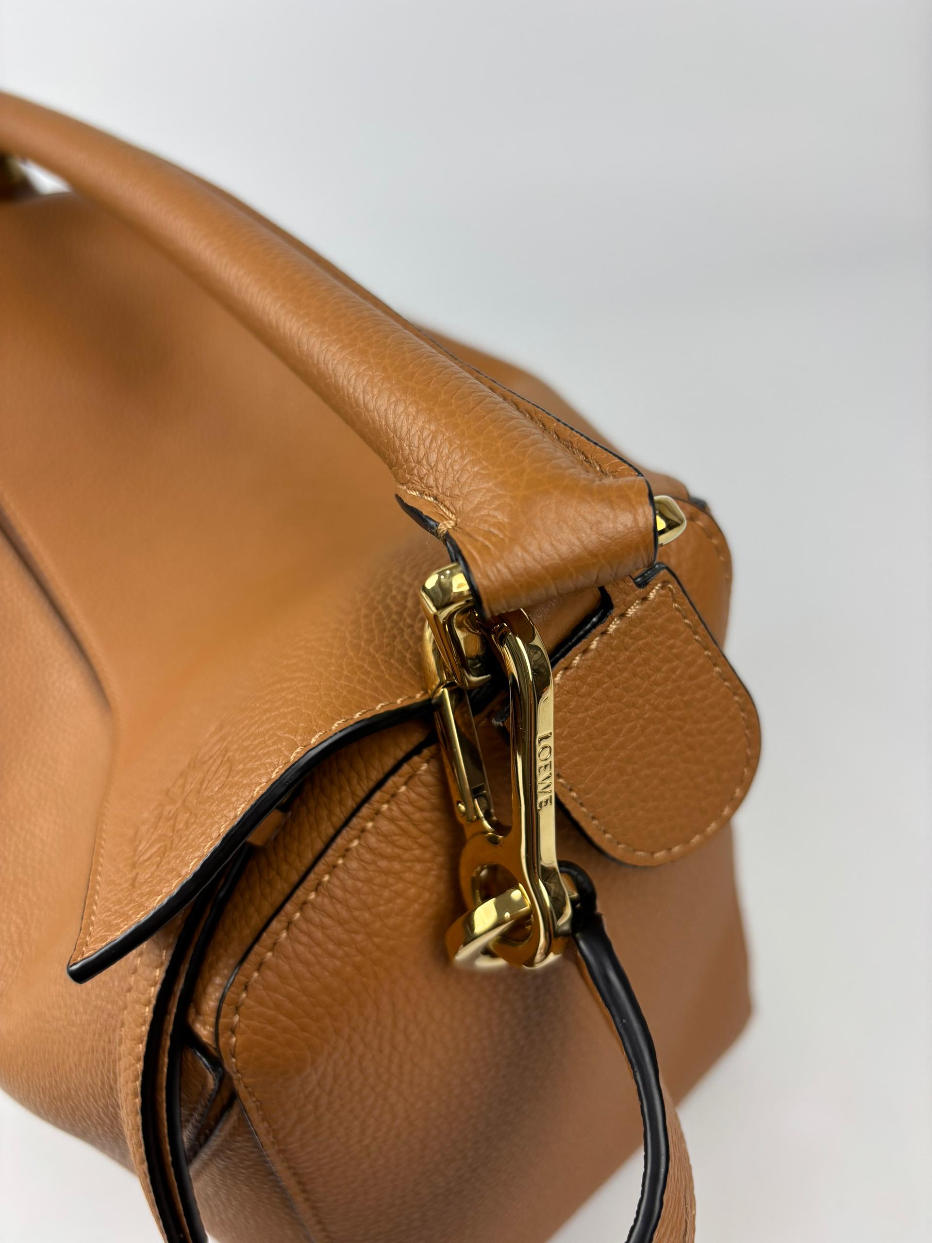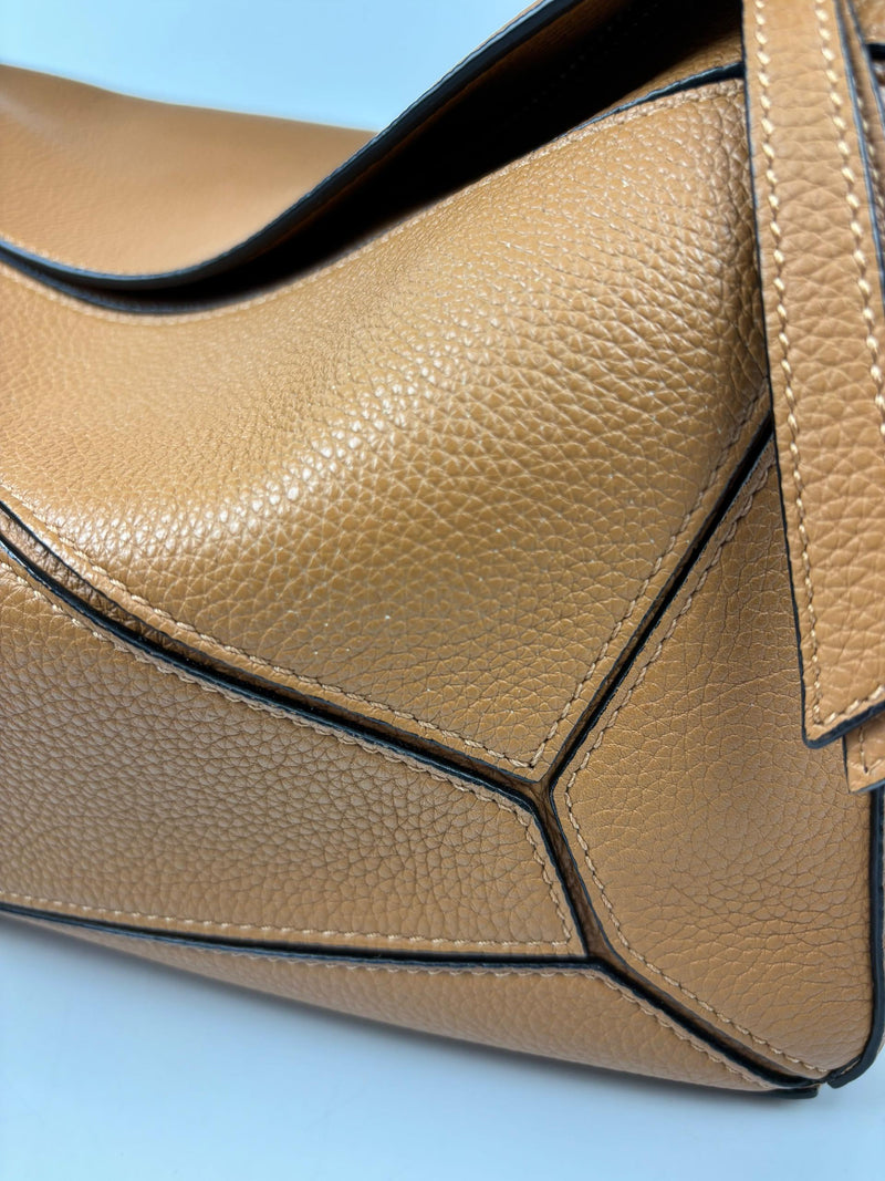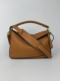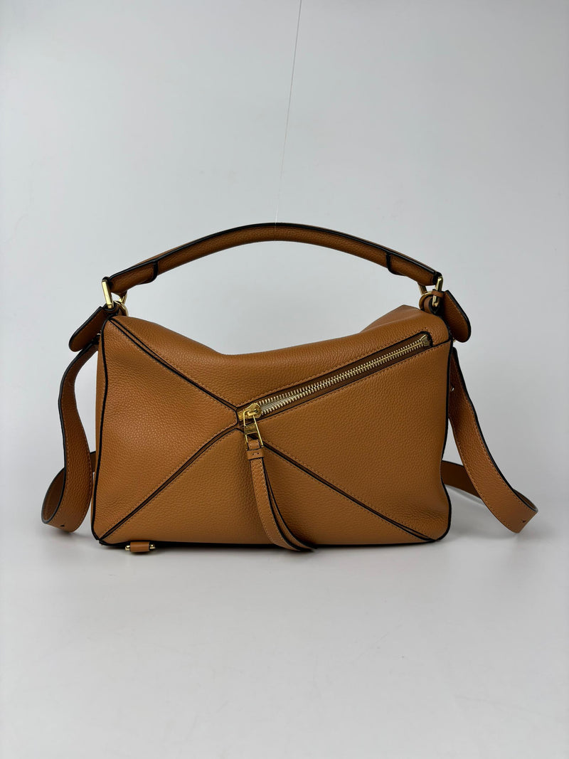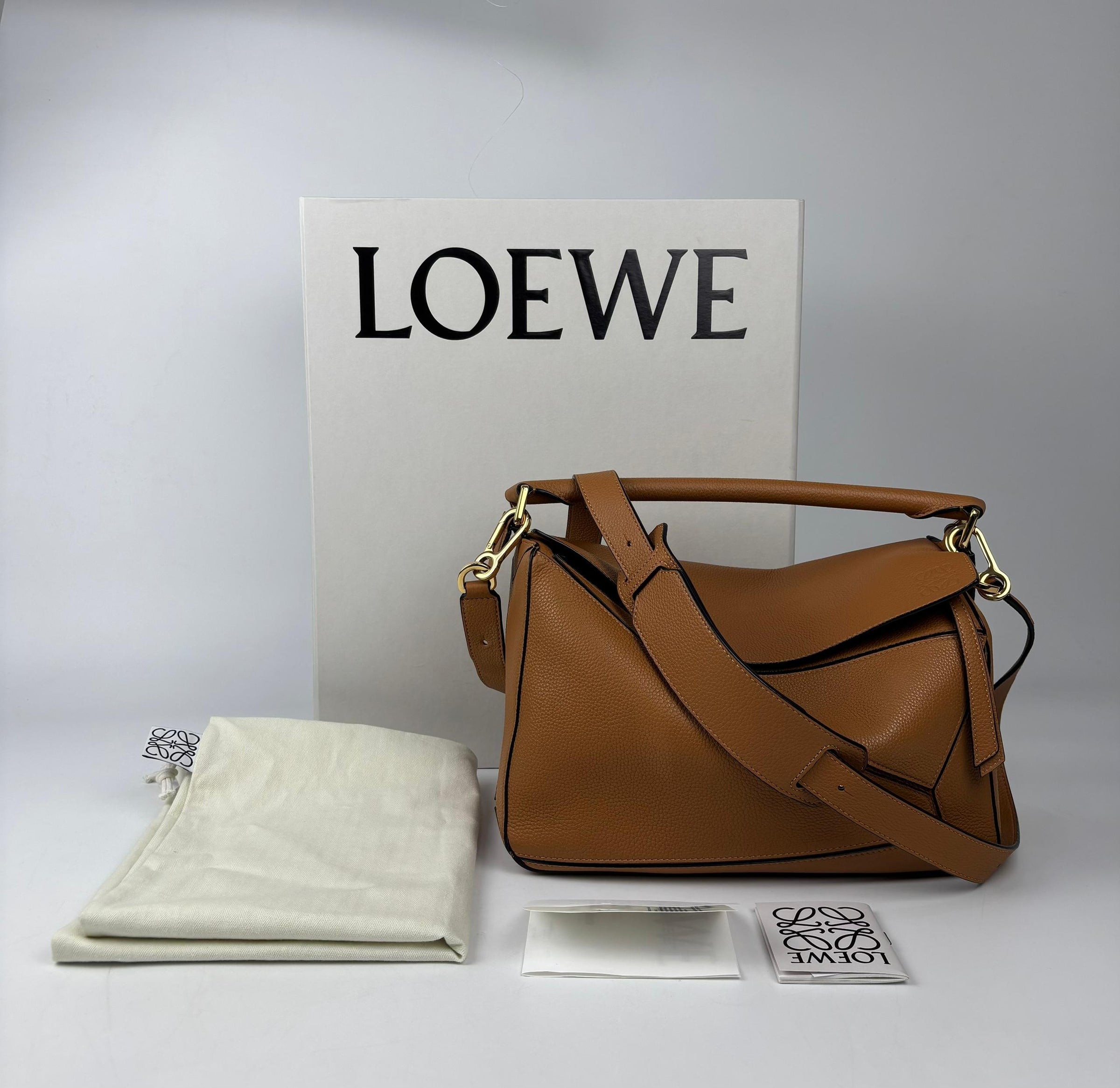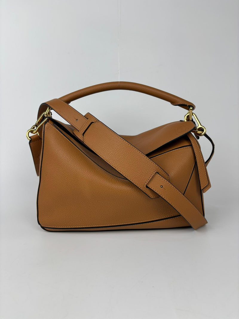 Crafted from rich tan calfskin, the Loewe Medium Puzzle Classic Bag features a distinctive origami-inspired design that elevates any ensemble with its architectural elegance. Its versatile styling allows seamless transition from day to night, while the spacious interior offers ample room for essentials, combining practicality with refined sophistication.