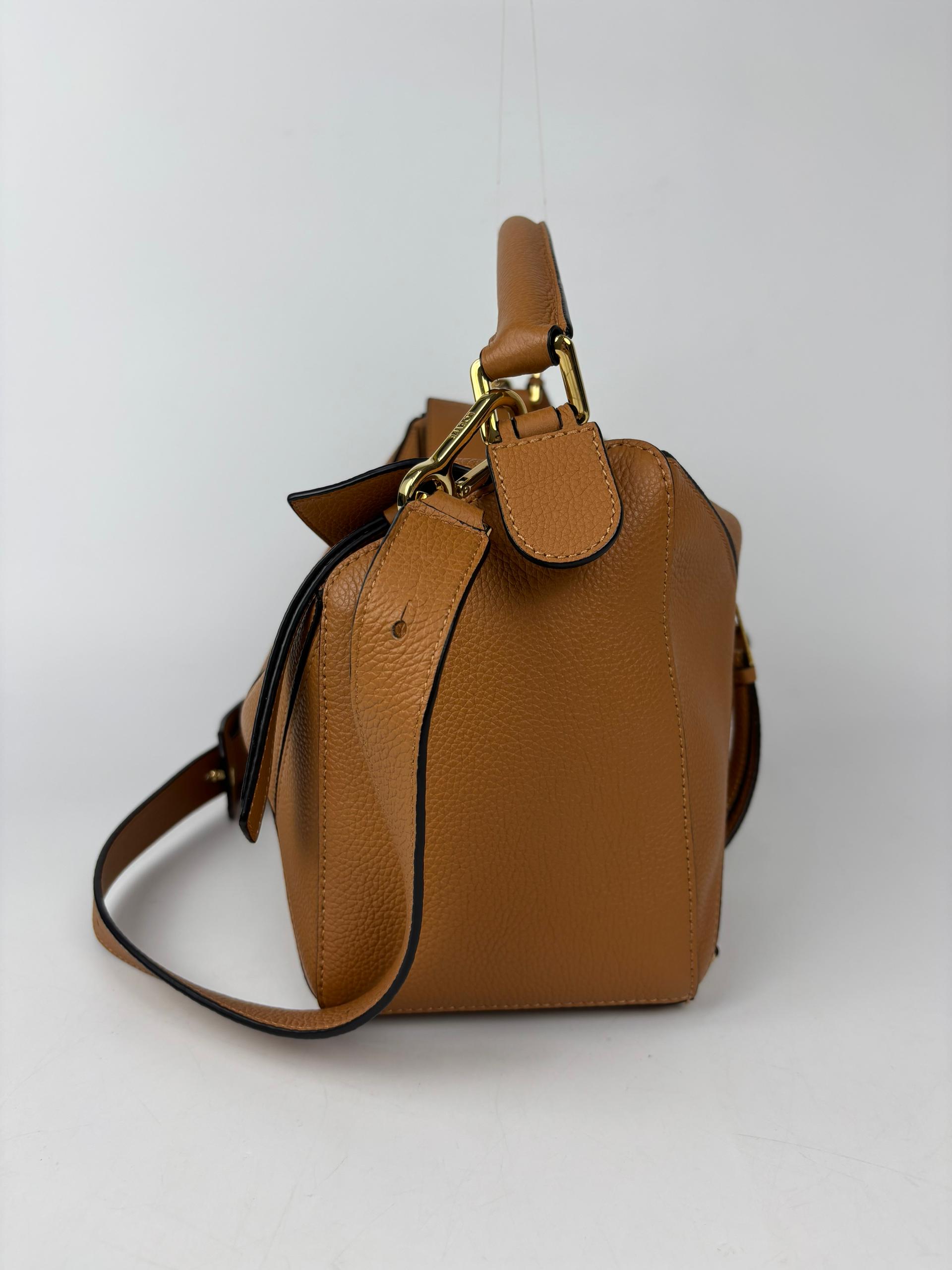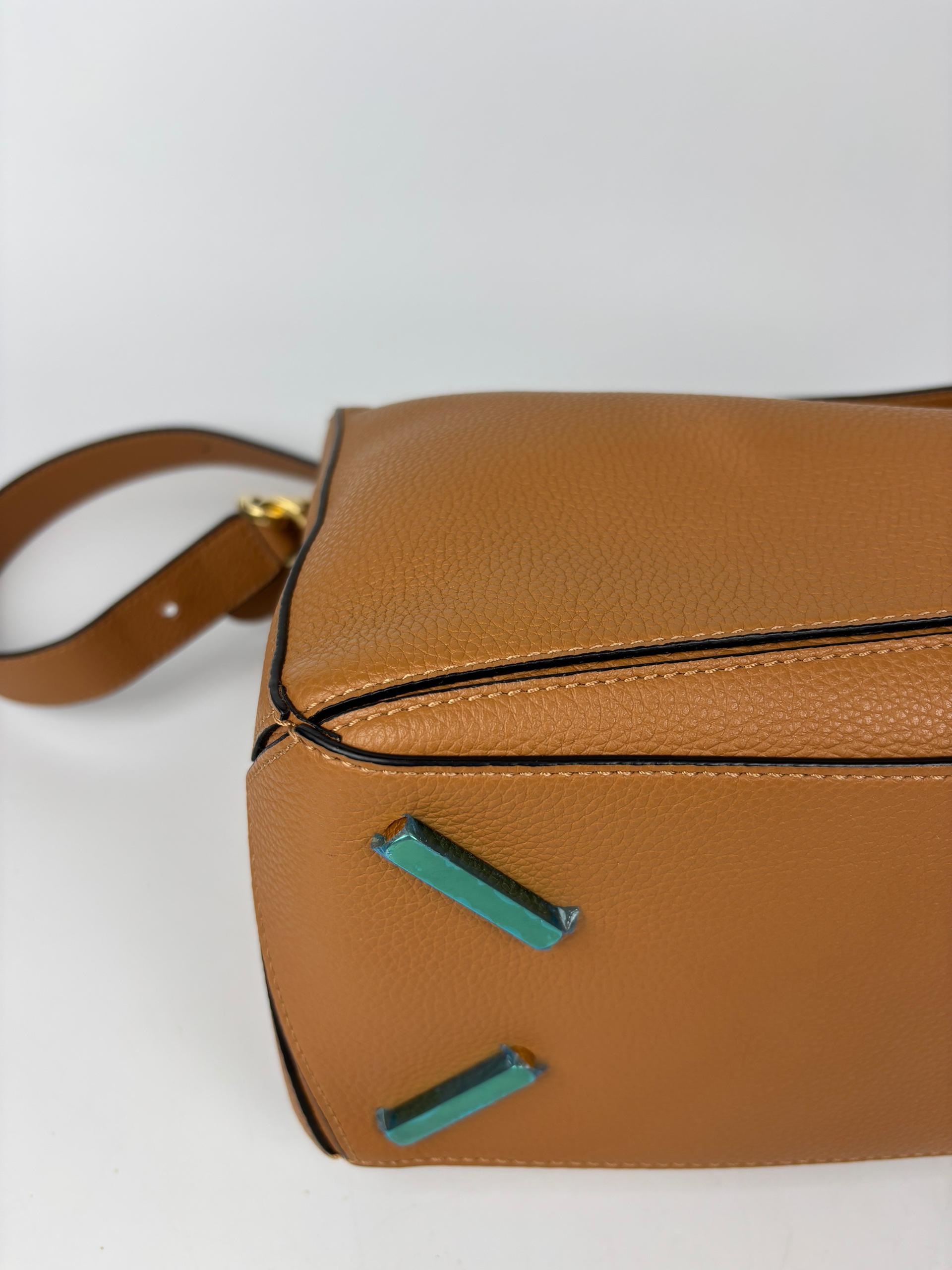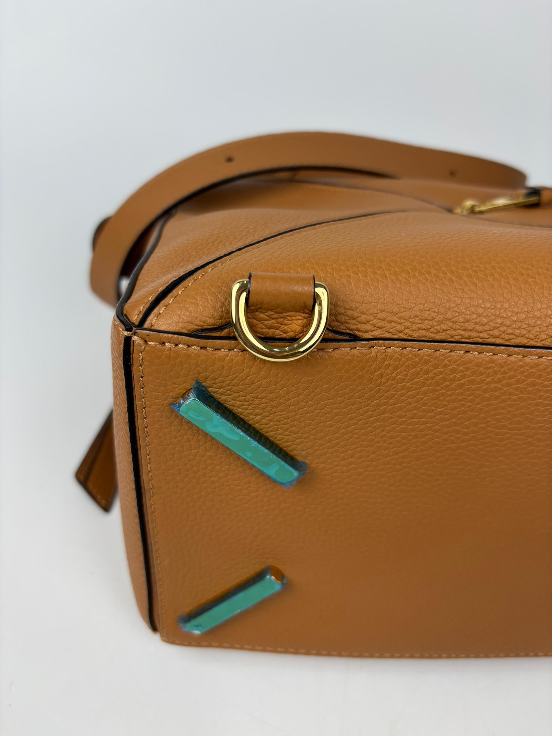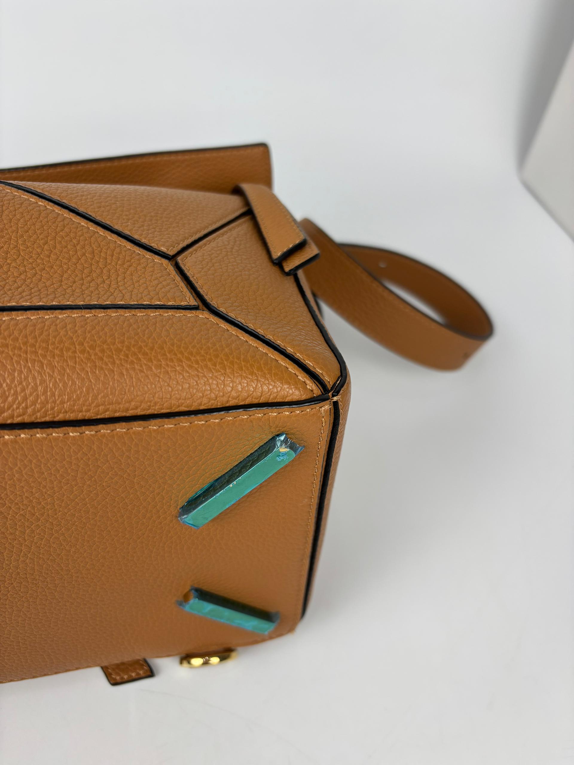 Crafted from rich tan calfskin, the Loewe Medium Puzzle Classic Bag features a distinctive origami-inspired design that elevates any ensemble with its architectural elegance. Its versatile styling allows seamless transition from day to night, while the spacious interior offers ample room for essentials, combining practicality with refined sophistication.