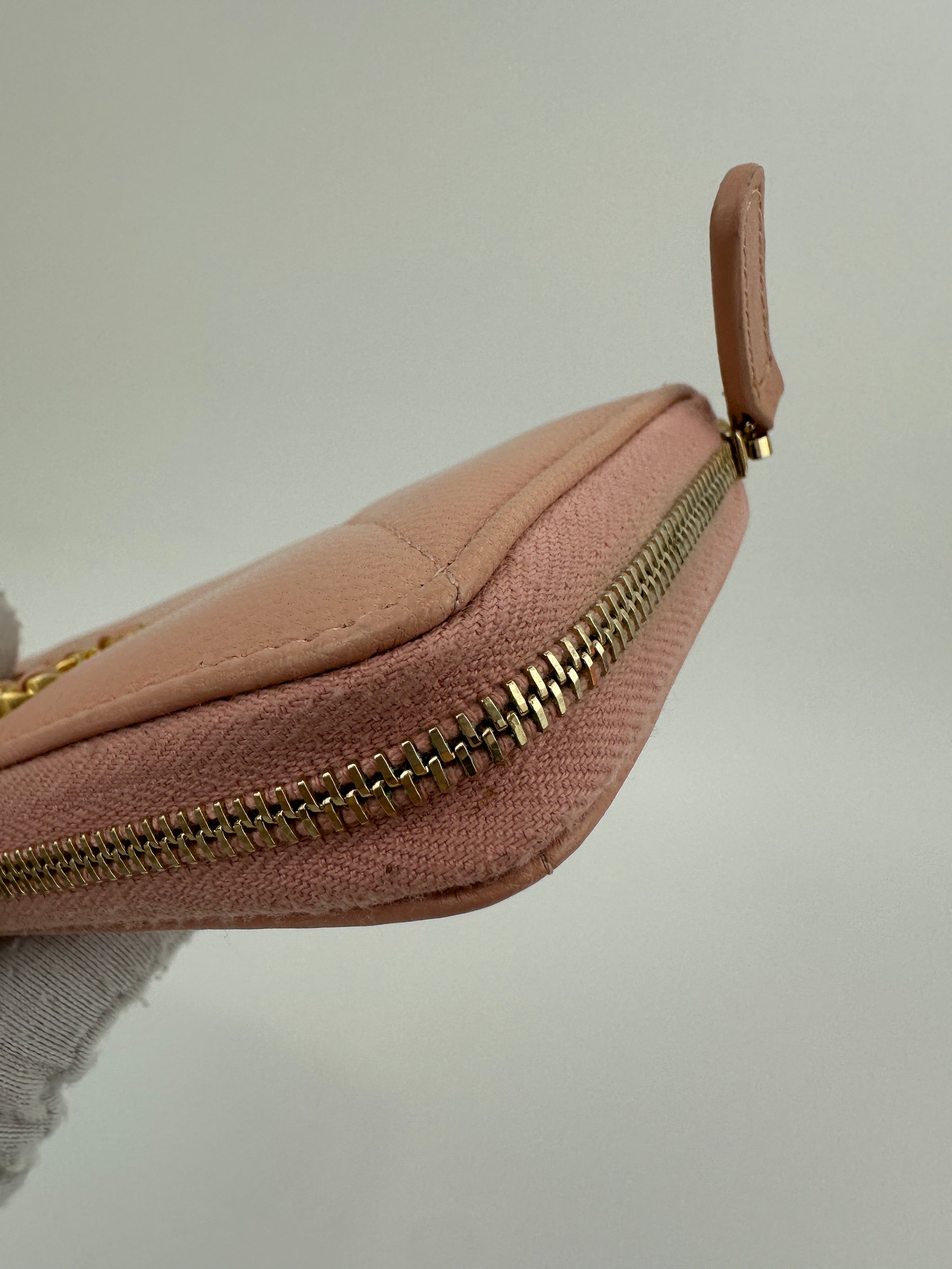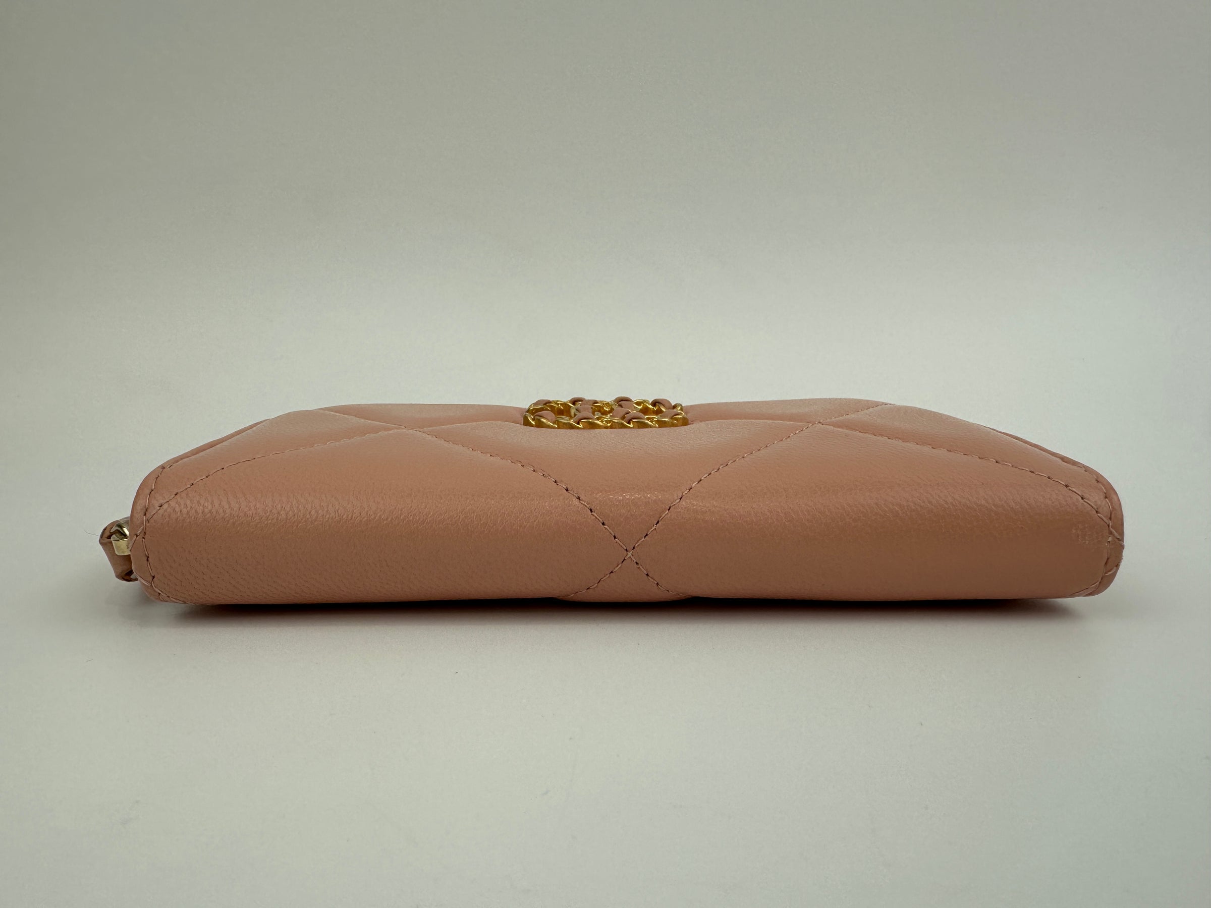 Crafted from sumptuous quilted lambskin, this 19 zip-around long wallet combines elegance with everyday practicality. The soft light pink hue exudes refined femininity, while the gold-toned hardware adds a touch of luxury. Featuring a full zip closure for secure storage, this wallet accommodates cards, coins, and bills with ease. The quilted texture provides subtle visual interest and a luxurious tactile experience.